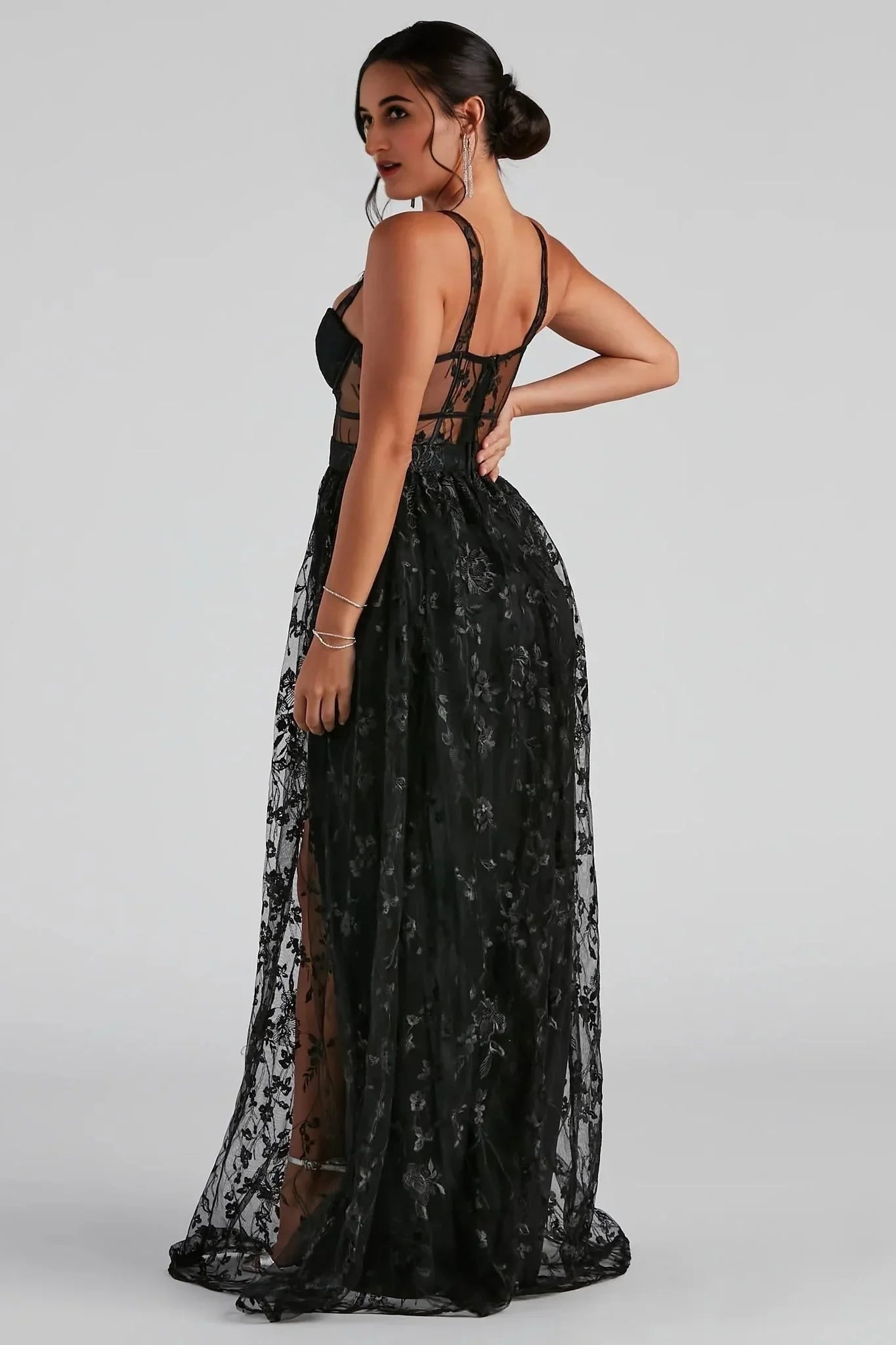 Create timeless elegance with a formal prom dress that impresses with stunning details. Alina features a sleeveless sweetheart neckline, sheer lace shoulder straps, and a partially sheer illusion lace bodice. The bodice features a corset-like design, padded and lined cups with underwire, and contrast piping seams. The slim-fit bodice leads to a flowy A-Line silhouette that is perfect for making a grand entrance. Alina is composed of a sheer lined mesh fabric with floral embroidery throughout and includes a floor-length knit lining with a high side slit. The dress offers minimal stretch. Complete your outfit with and a sleek clutch.
