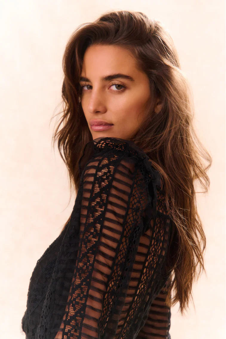 Introducing the Alonsa Dress. This Victorian-inspired faux wrap mini dress stuns with a soft mesh wash giving this piece a vintage look and feel. Mini pleats are stripped throughout with sheer, crochet lace details all over. This mini begins with long blouson sleeves with elasticated cuffs, a deep v-neckline that falls to an elasticated, smocked waist before descending to a flowy, pleated skirt.