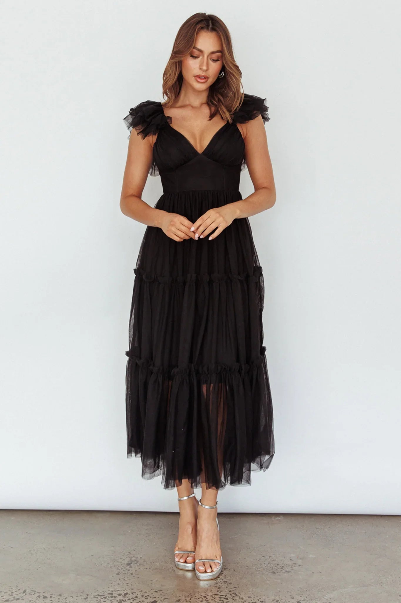 You'll look like you just stepped out of Heaven in our gorgeous Amal midi dress. We are in love with its floaty tulle fabric and gorgeous ruffle shoulders. Perfect for a wedding or special occasion. Team it with black heels and a satin clutch for an unforgettable look.