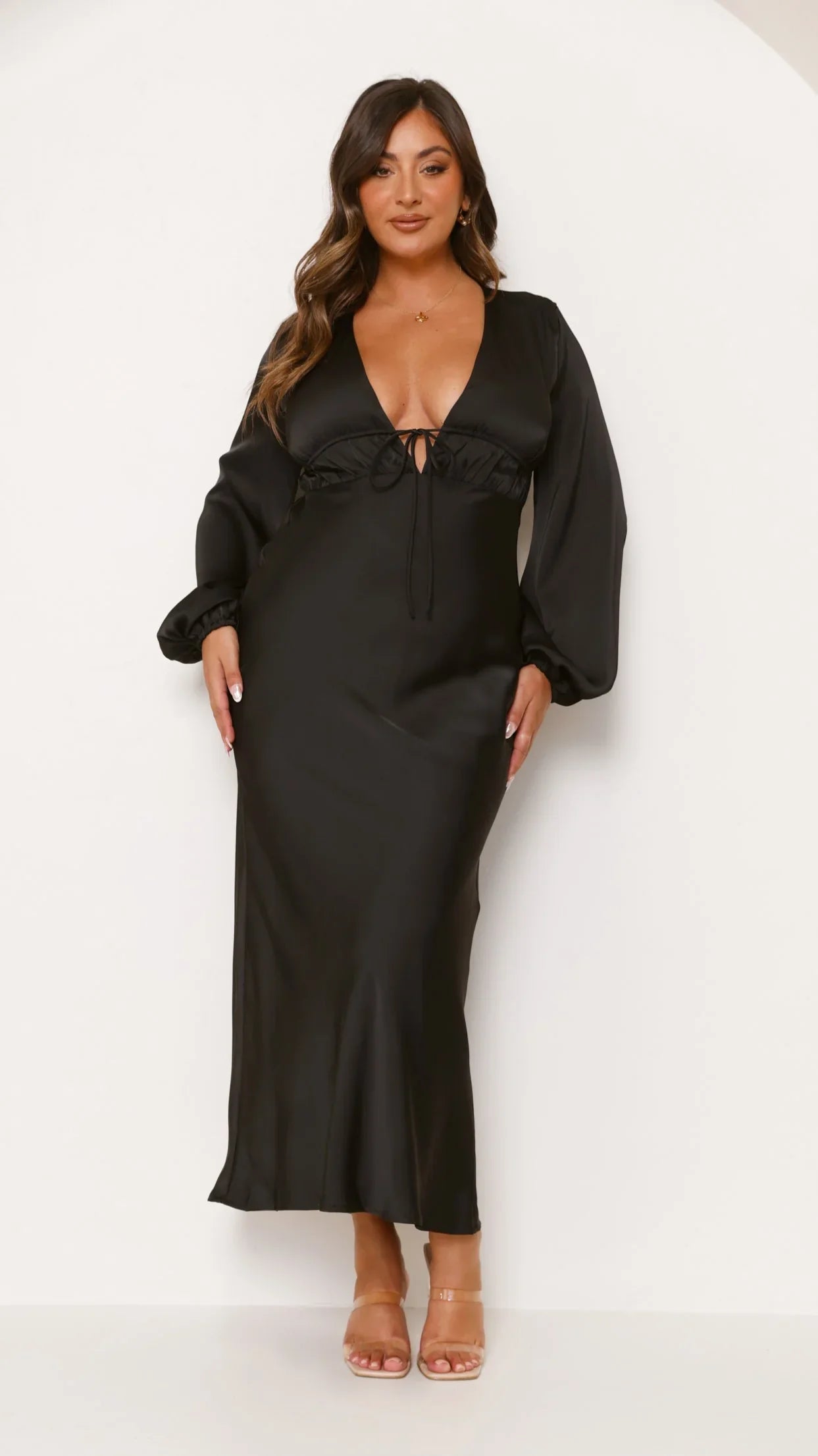 Our Amara Maxi Dress is the definition of elegance. This timeless piece features a flattering silhouette, long sleeves and v-neckline. Style with some simple gold accessories and neutral heels.
