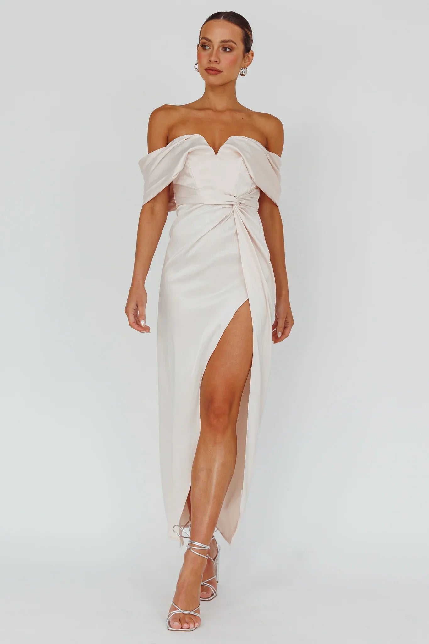 Steal the spotlight in our stunning Amaryllis maxi dress. We are head over heels for its off-shoulder style and twist feature in the bust. It's perfect for a wedding or special occasion teamed with diamante heels and a satin clutch for an unforgettable look.