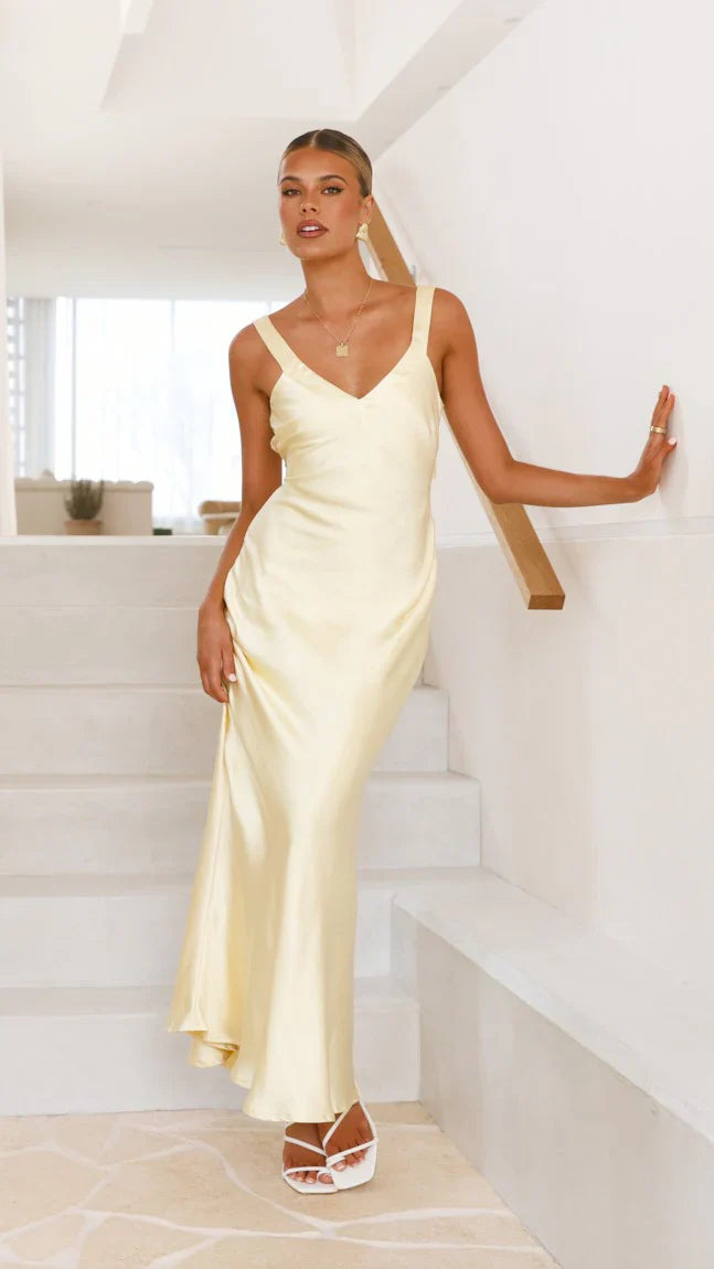 This elegant maxi dress features a V-neckline with a triangular bust and wide fixed straps. It includes an invisible side zipper and a low scoop back adorned with cross detailing. The dress is fully lined for a polished finish.
