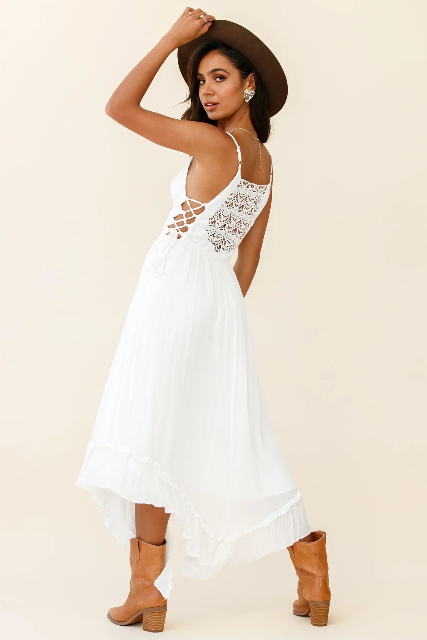 Look like you just stepped out of heaven in our ethereal angel dress. Featuring beautiful, fine crochet paneling over the bust and cheeky lace-up sides. This dress is feminine, floaty and, well, heaven. We love the pointed hem with ruffle trimming. Pair it with tan sandals for a cute daytime look, or dress it up with some nude heels.