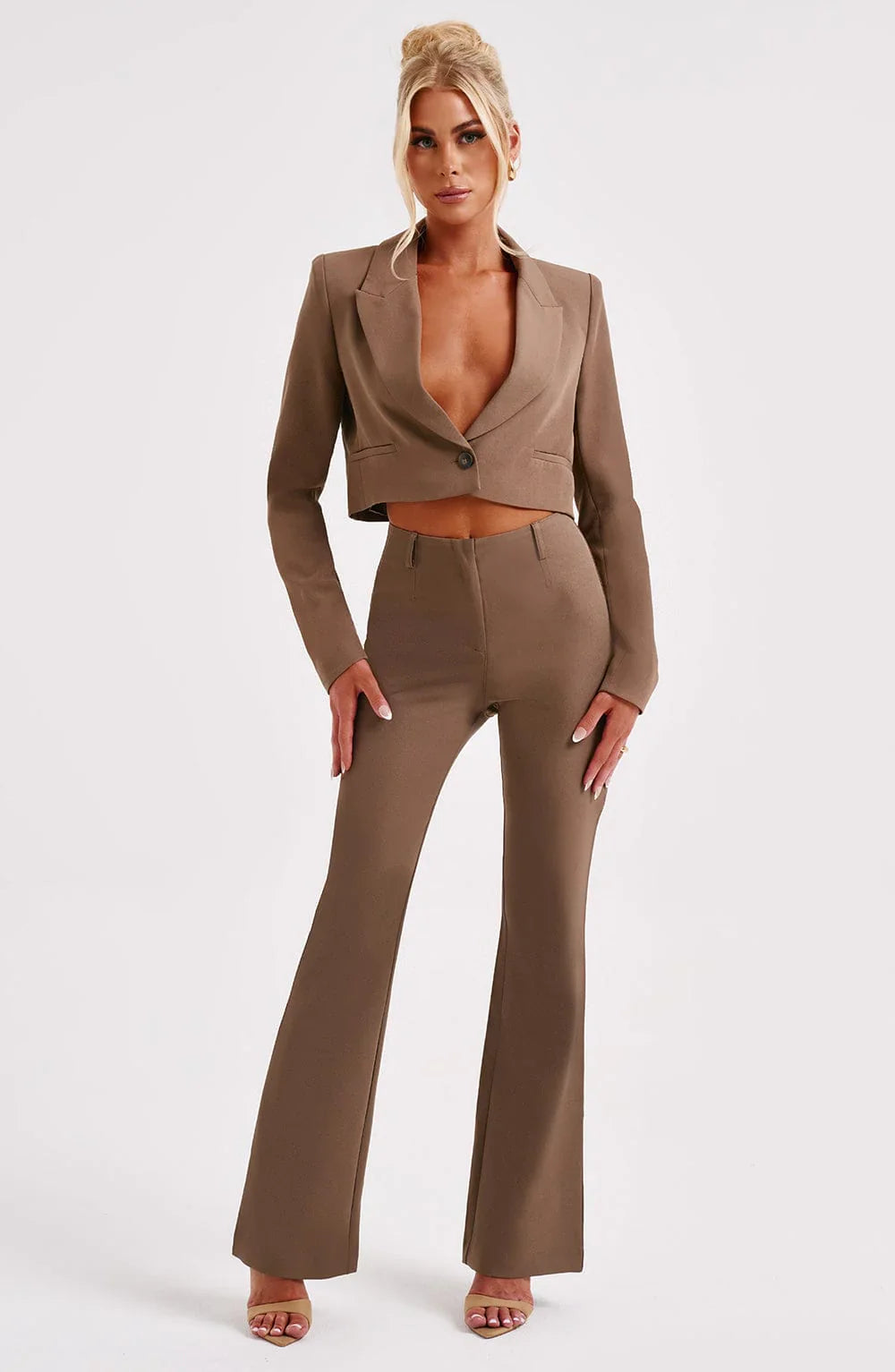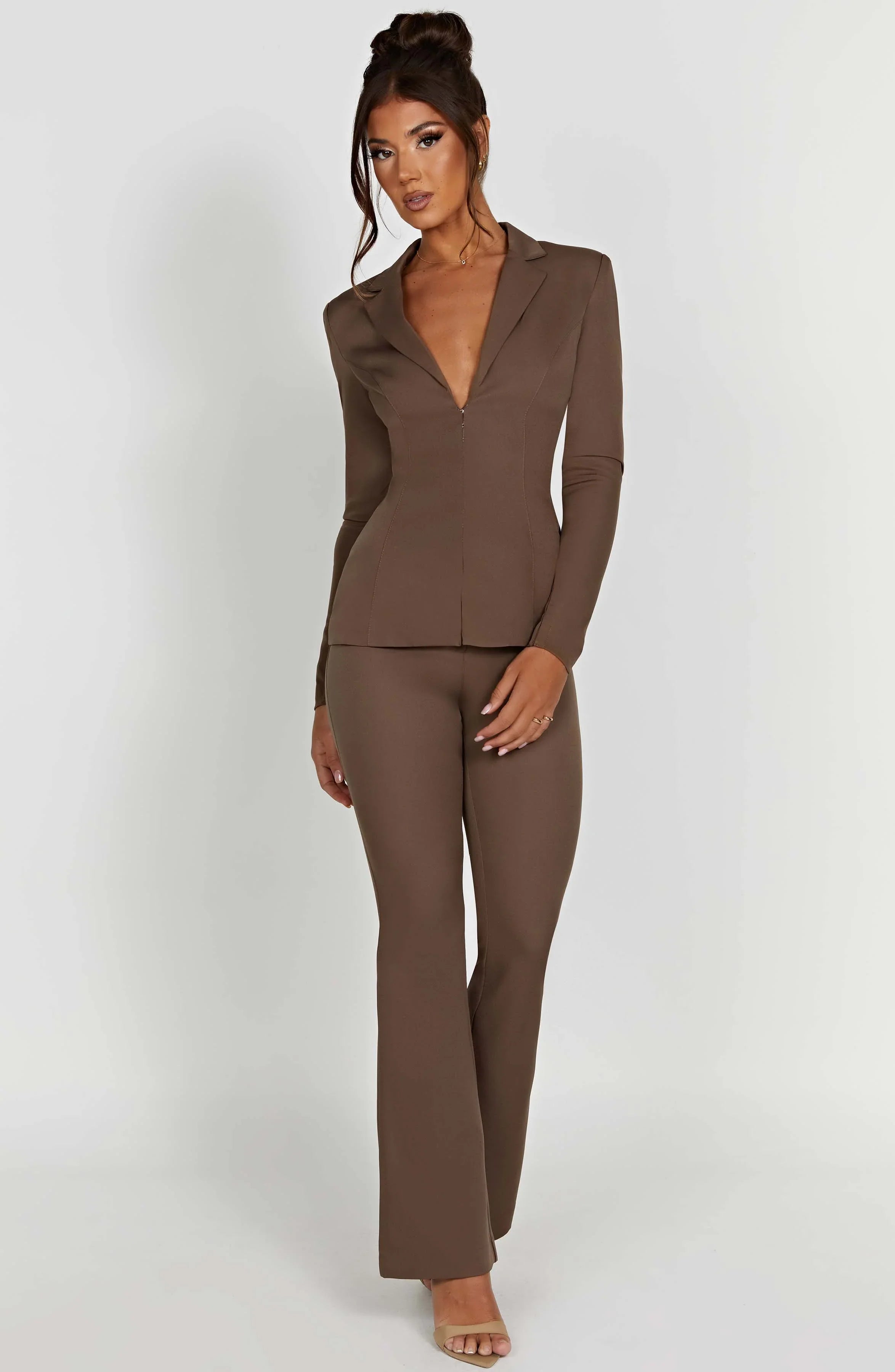 Say hello to the suiting of your dreams. The Aspen trousers are sleek, sexy, tailored perfection, made in premium stretch bengaline for a super flattering fit. With a body hugging fit and flared leg, pair with the Aspen jacket and neutral heeled mules.