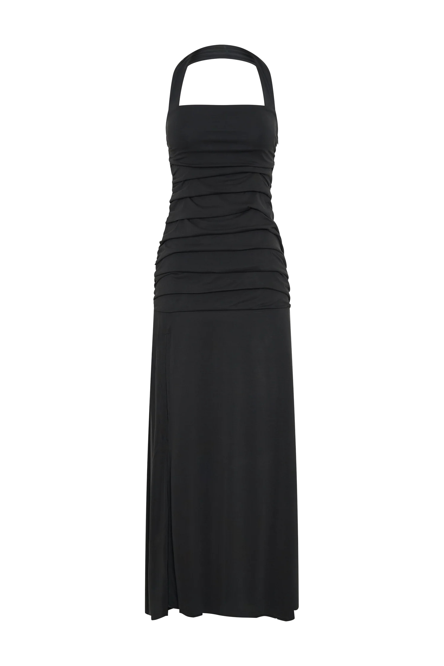 The BENTLEY Peached Jersey Halter Maxi Dress combines modern elegance with a flattering silhouette. Featuring a halter neckline and a ruched bodice that extends to the lower hip, this dress accentuates your figure while providing a comfortable fit. The flared lower skirt adds graceful movement, and the leg split enhances the dress's dramatic effect. Lined for a smooth finish, this dress reaches a maxi length, making it a perfect choice for formal events or elegant evening outings.