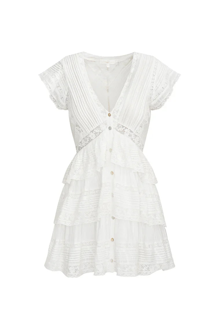 Introducing the Binselle Dress. This pretty mini features an airy, cotton fabric and begins with sweet flutter sleeves and a v-neckline. The flirty piece features custom lace detailing throughout, buttons down the center front, and a romantic, ruffle-tiered skirt with pintucking details all over. The back is smocked for easy and comfortable wear.