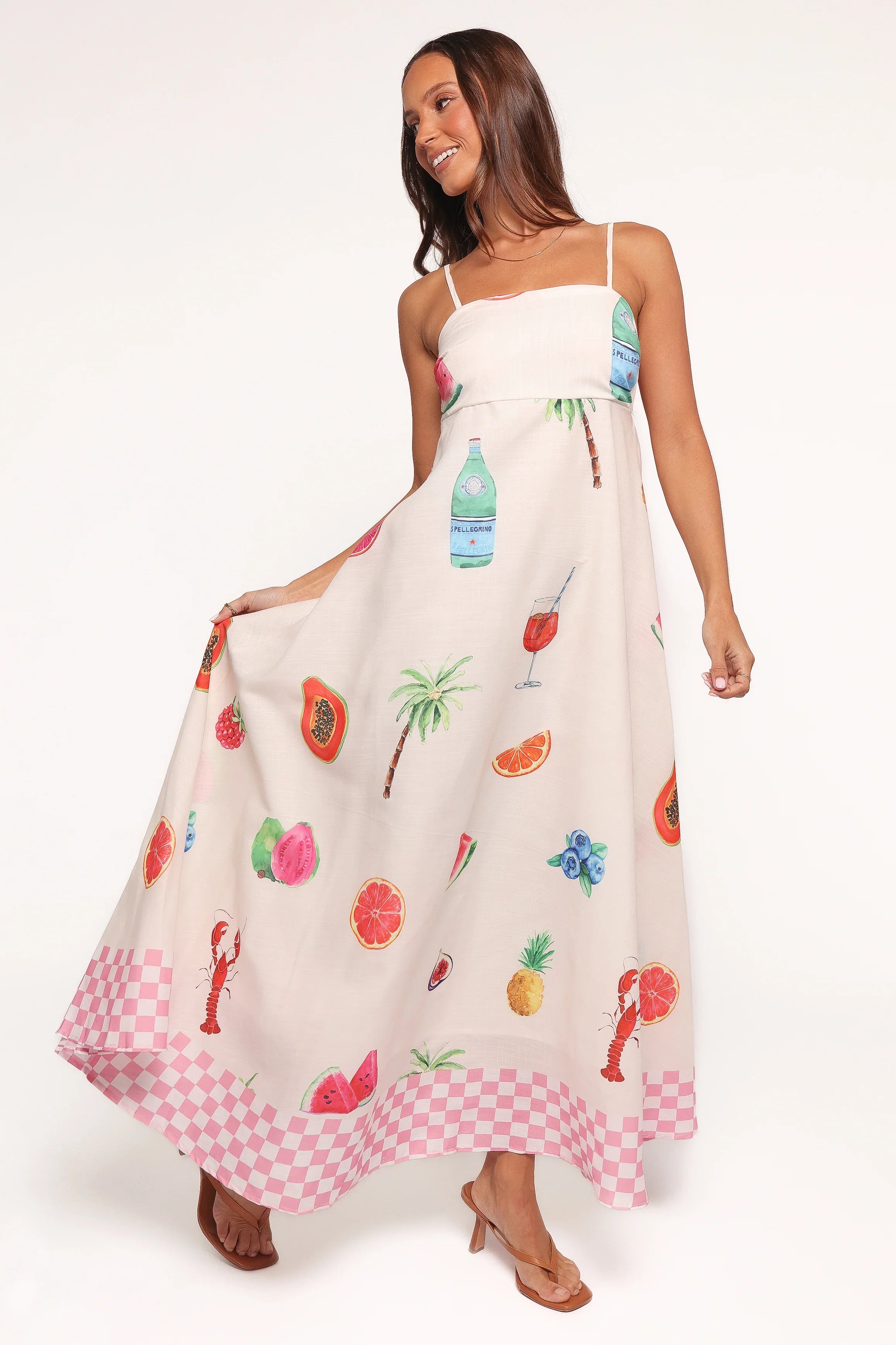 DETAILS Make an entrance in the Brea Maxi Dress! This stunning maxi-length design features delicate spaghetti straps, a square neckline, and a shirred back detail for a flattering fit. With its bold Tutti Fruitti print, it's the perfect mix of chic and effortless style your go-to for any occasion.
