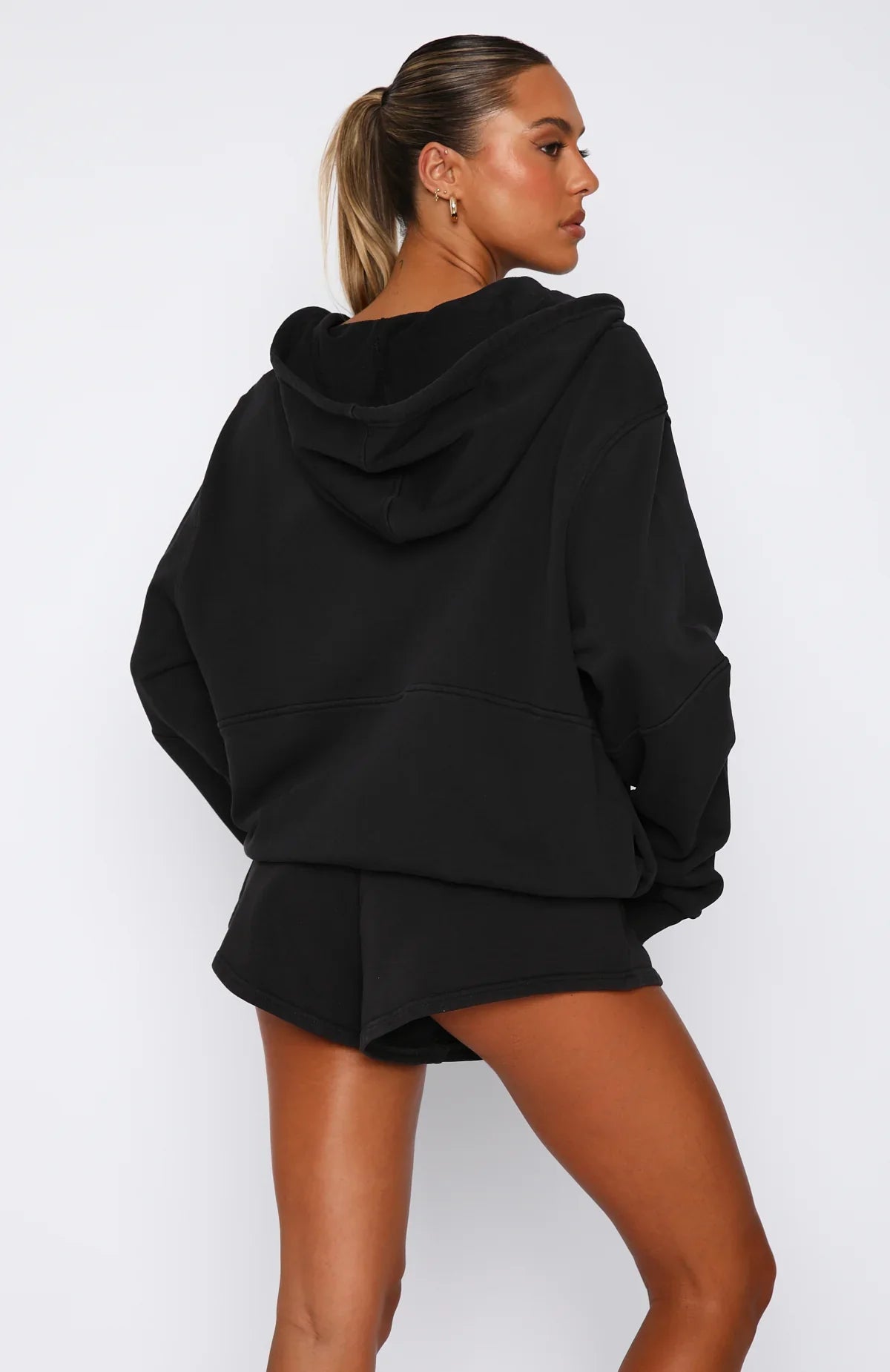 We're obsessing over this hoodie for your stay at home look! Cameron Zip Front Hoodie Vintage Black features oversized fit, zip front, vintage feel, hood, ribbed cuffs and soft fleece lined fabric for extra comfort. We love this styled with the Tommy Lounge Shorts.
