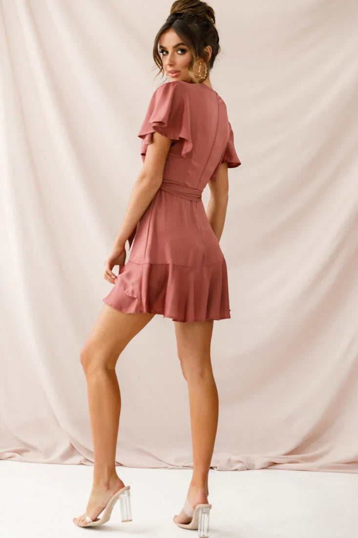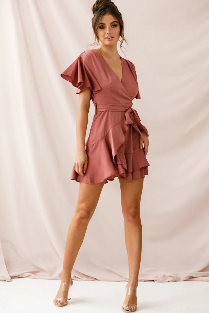 Hey pretty lady, you're causing quite the commotion in our sweet, sexy and silky Cami dress! Featuring a faux wrap skirt that ties at the waist, an on-trend ruffle hemline and fluttery angel sleeves. Team it with delicate gold jewelry and nude heels and sashay your way across the dance floor, right in front of that hottie who's been staring at you all night (a.k.a. your future ex-boyfriend).