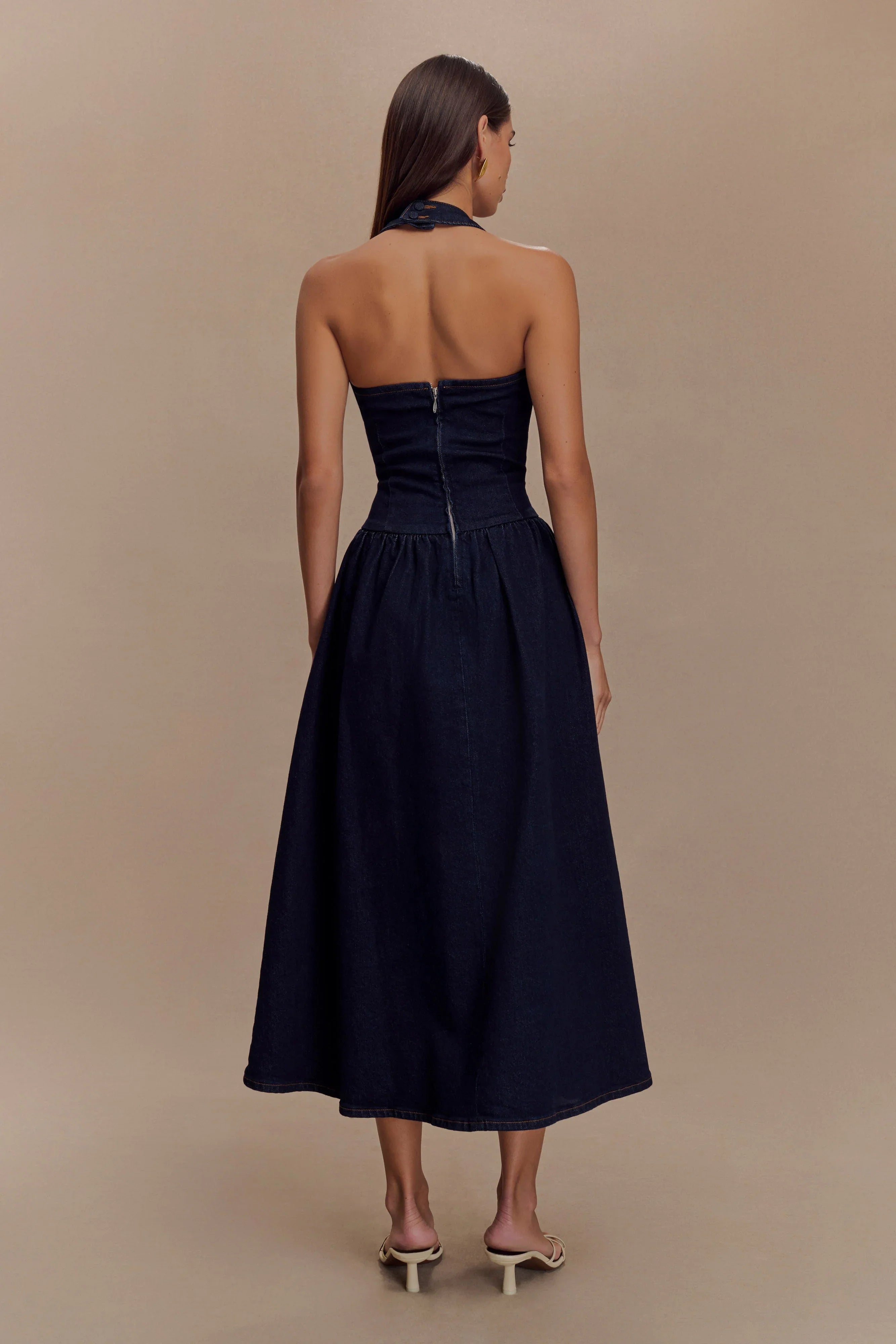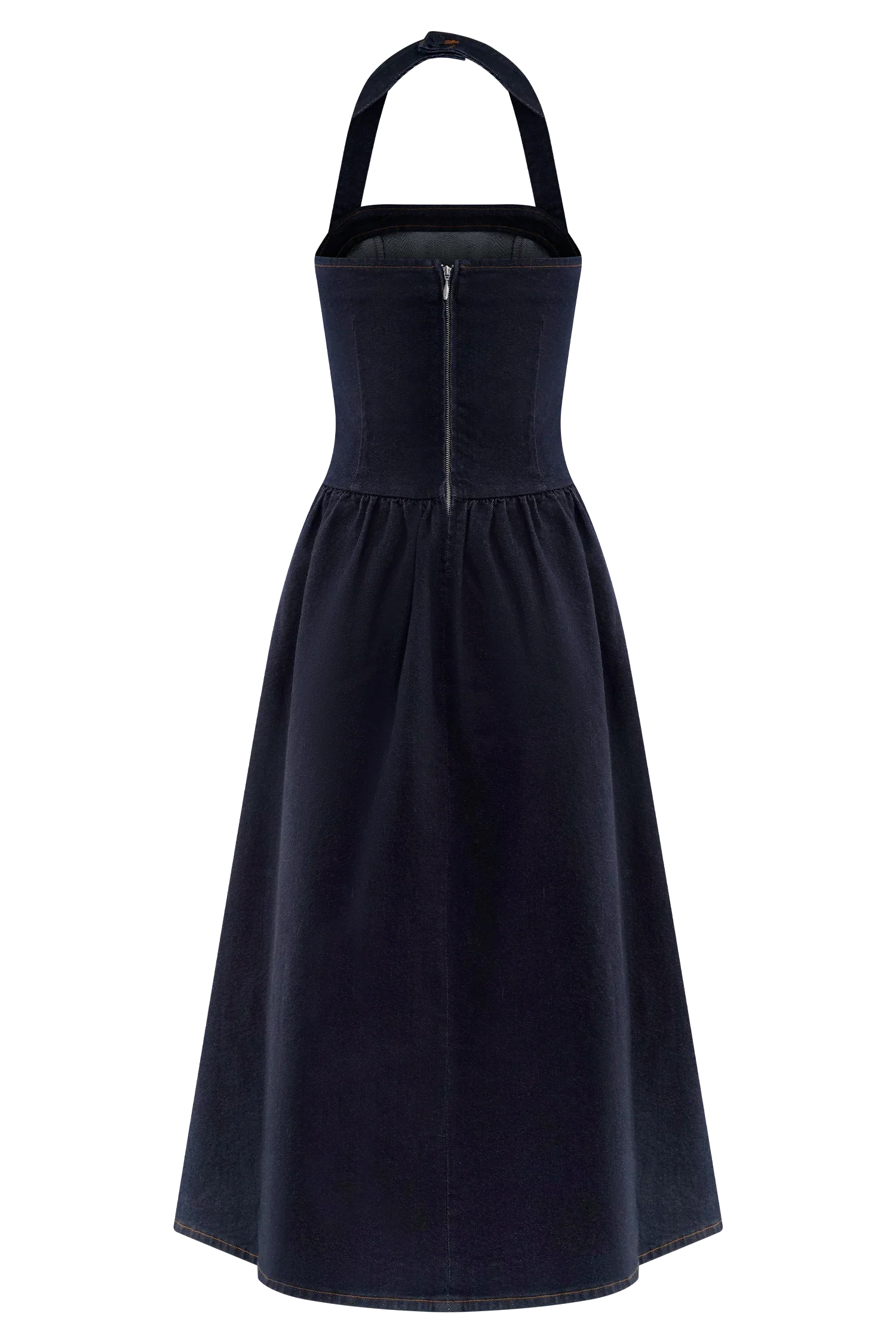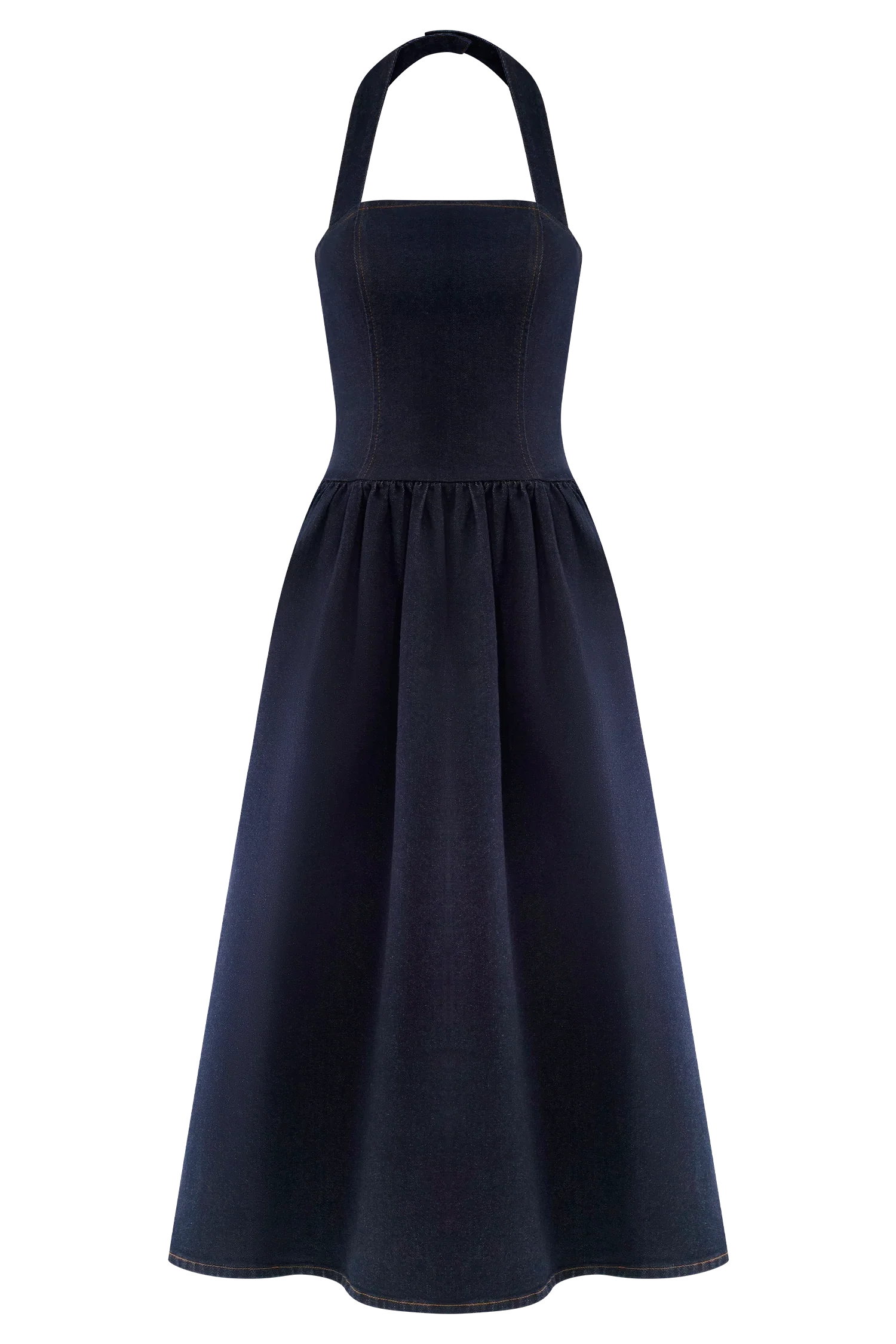 The CAROLINE Denim Halter Midi Dress is a bold fusion of structure and femininity. Designed with a sleek halter neckline that fastens with buttons at the back, this dress creates a sculpted, sophisticated silhouette. Front and back seams enhance the fit, contouring the body before flowing into a flared skirt from a fitted drop waist. An exposed back zipper adds a modern edge, making this dress the perfect choice for effortless day-to-night dressing with a touch of denim elegance.