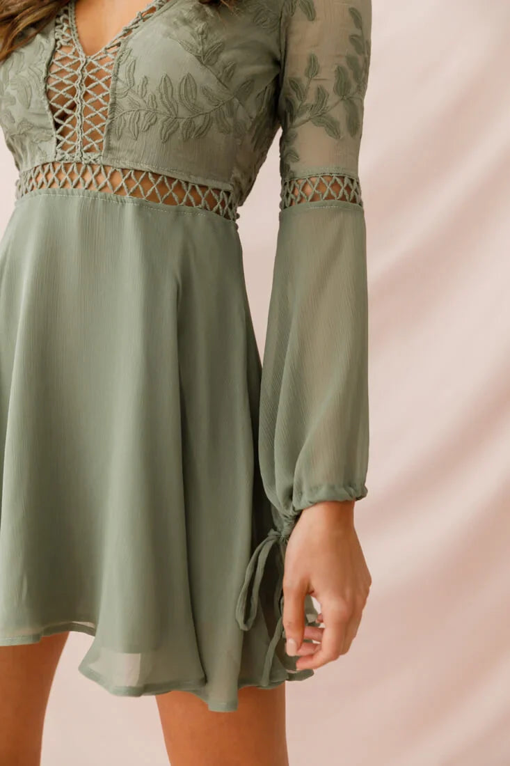 Feminine and fun, Carson is a free spirit who likes road trips to the dessert, singing Britney's greatest hits at the top of her lungs. Channel those boho vibes in our super cute Carson dress featuring pretty crochet work throughout the torso and around the elbows and a breezy A-Line skirt. We're loving the on-trend bell sleeves with a drawstring tie around the wrist and deep V back that string-ties together at the top. Pair it with tan cowboy boots and a felt hat.