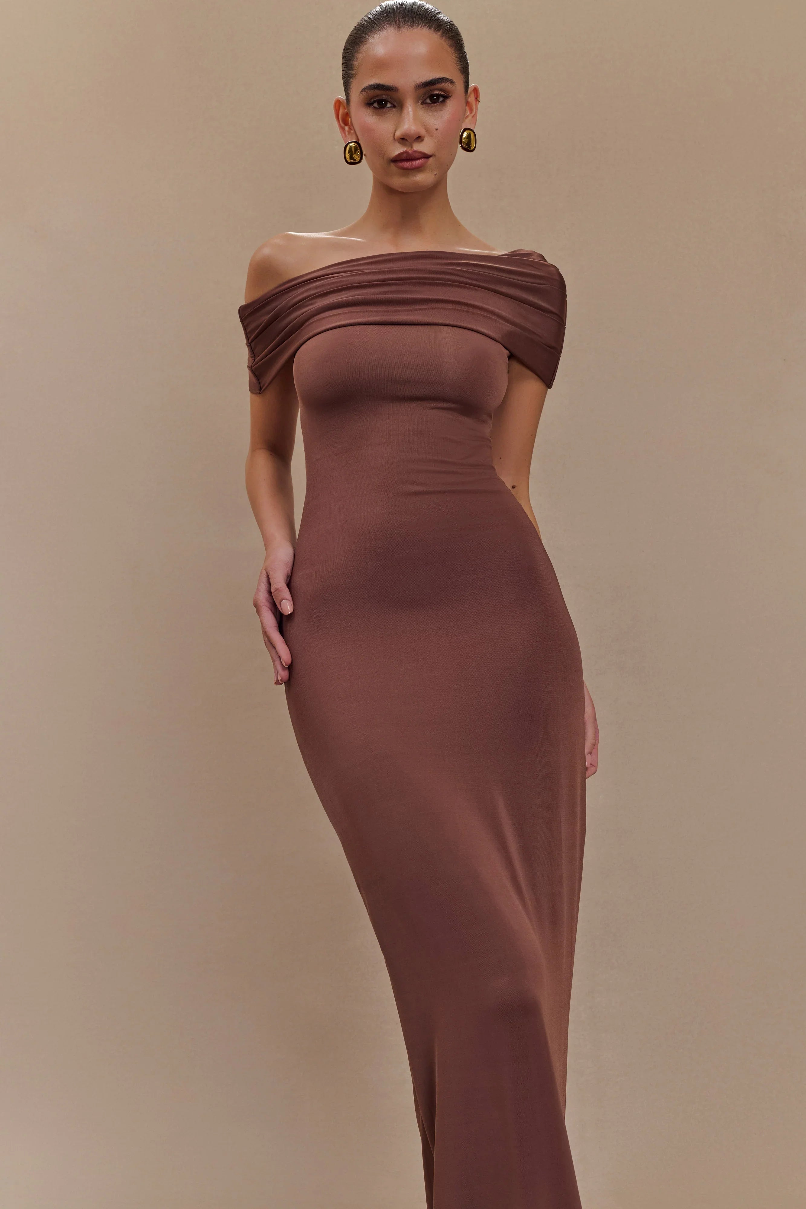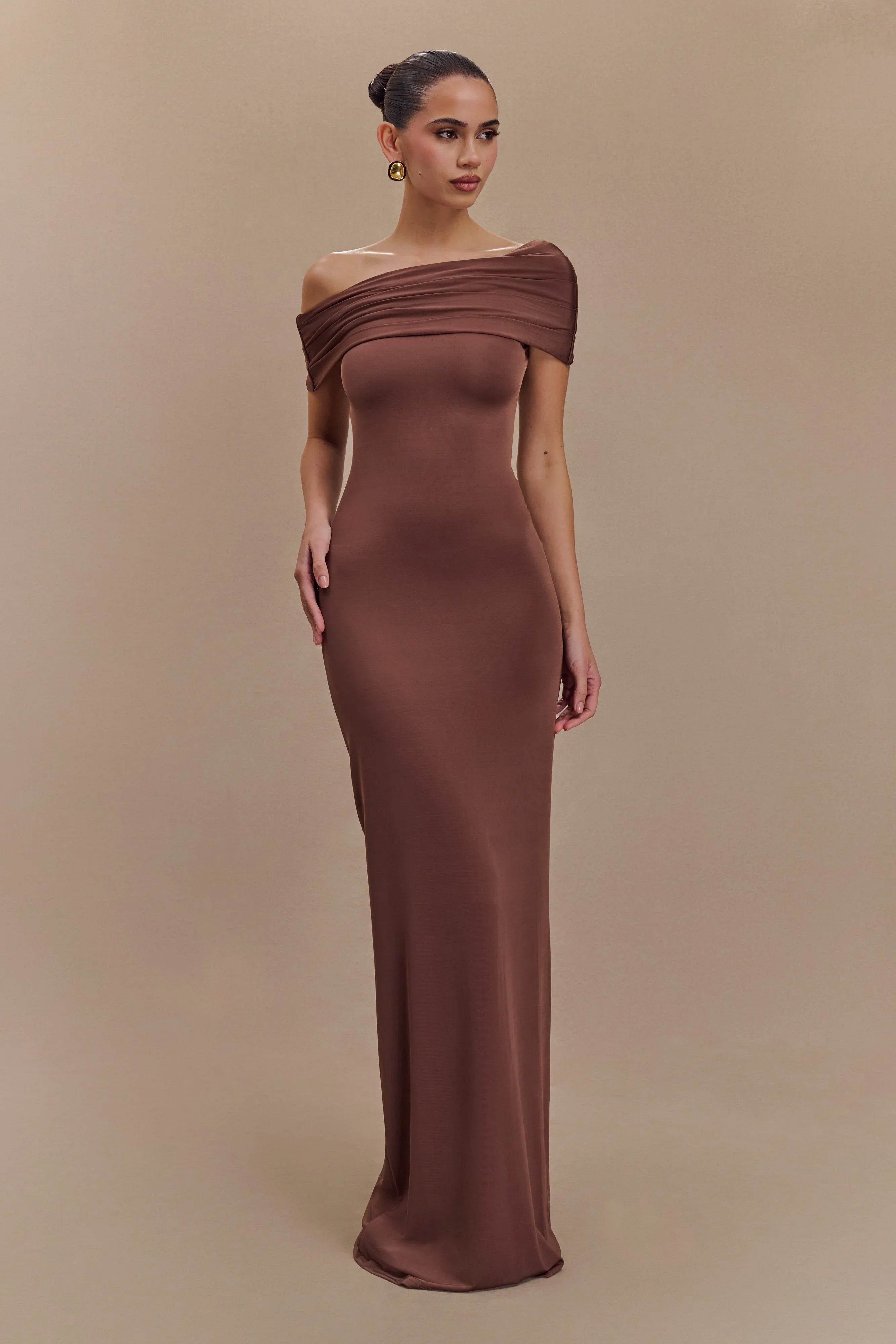 The CASSANDRA Off Shoulder Slinky Maxi Dress exudes sophistication with a touch of allure. Its asymmetrical neckline adds a modern twist, framing the shoulders beautifully. With drop shoulders providing an elegant drape, this dress offers effortless charm. The ruched overlay adds texture and dimension, enhancing the silhouette with subtle intrigue. Lined for comfort and quality, and featuring a bodycon fit, the Cassandra is a versatile and chic choice for any occasion, ensuring you look and feel your best with every wear.