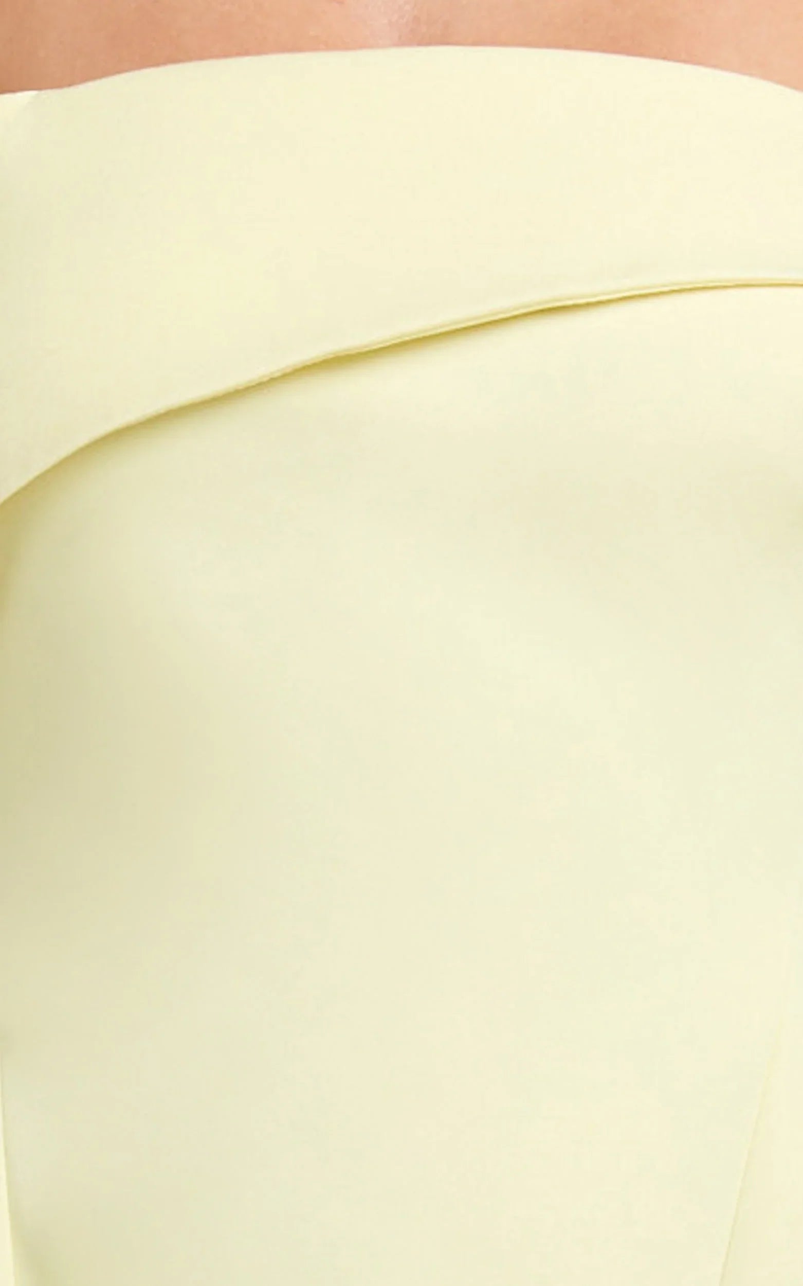 This lovely off-the-shoulder dress in a fresh lemon shade features playful tie details, highlighting your natural glow and giving you an effortlessly chic vibe. With eye-catching asymmetrical sleeves and a flattering, hourglass silhouette, this mini dress adds a touch of modern femininity to any look.