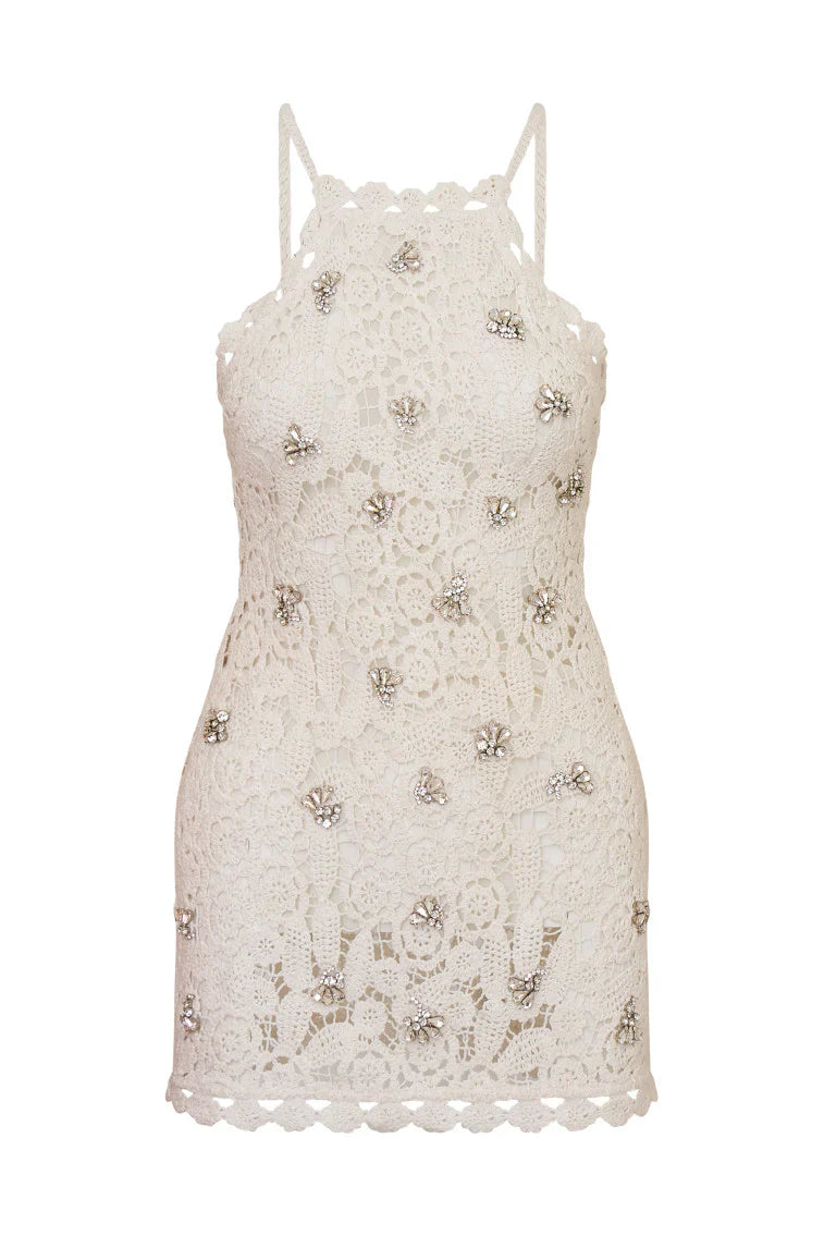 Vacay ready in the Considine Dress. Designed from a cotton crochet fabric, this intricate dress is all in the details. This elevated, hand-beaded mini debuts with crystal-and-rhinestone-adorned petals all over giving this piece a touch of shimmer. Delicate scallop trims line the neck and hem. With a stretch fabric, this dress gives a flattering, body-hugging fit. She’s the ultimate piece for your next beachy getaway.