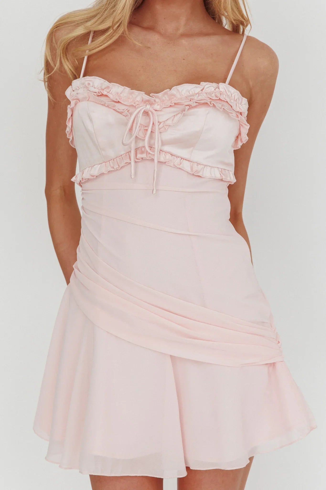 Hello, cutie! You will make an entrance in our gorgeous Dainty mini dress. It features the sweetest frill trim and bow tie in the bust. It's perfect for a cocktail party or birthday celebration teamed with kitten heels and a clutch for a dreamy look.