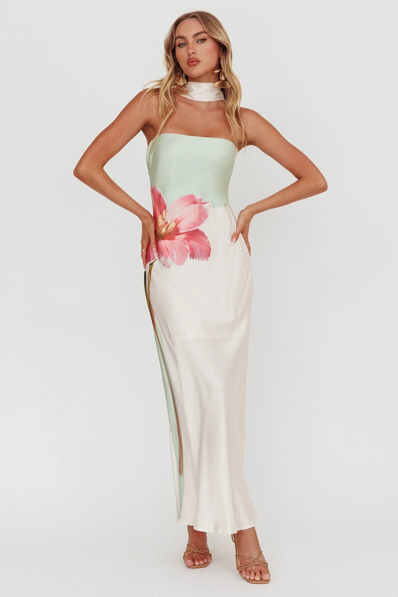 Make jaws drop in our gorgeous Damsel maxi dress. It features a pretty flower design and a chic necktie. It's perfect for a birthday dinner or special event. Team it with nude heels and a clutch for an unforgettable look.
