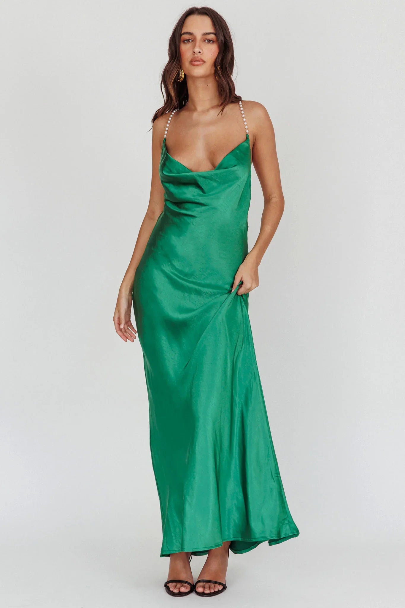 Jaws will drop when you walk by in our gorgeous Danijela maxi dress. Featuring faux pearl straps in the back and crafted with a soft, satin fabric. We're in love with the cowl neck and romantic opened back. It's perfect for bridal events or a birthday soiree. Team it with clear heels and a clutch for an unforgettable look.