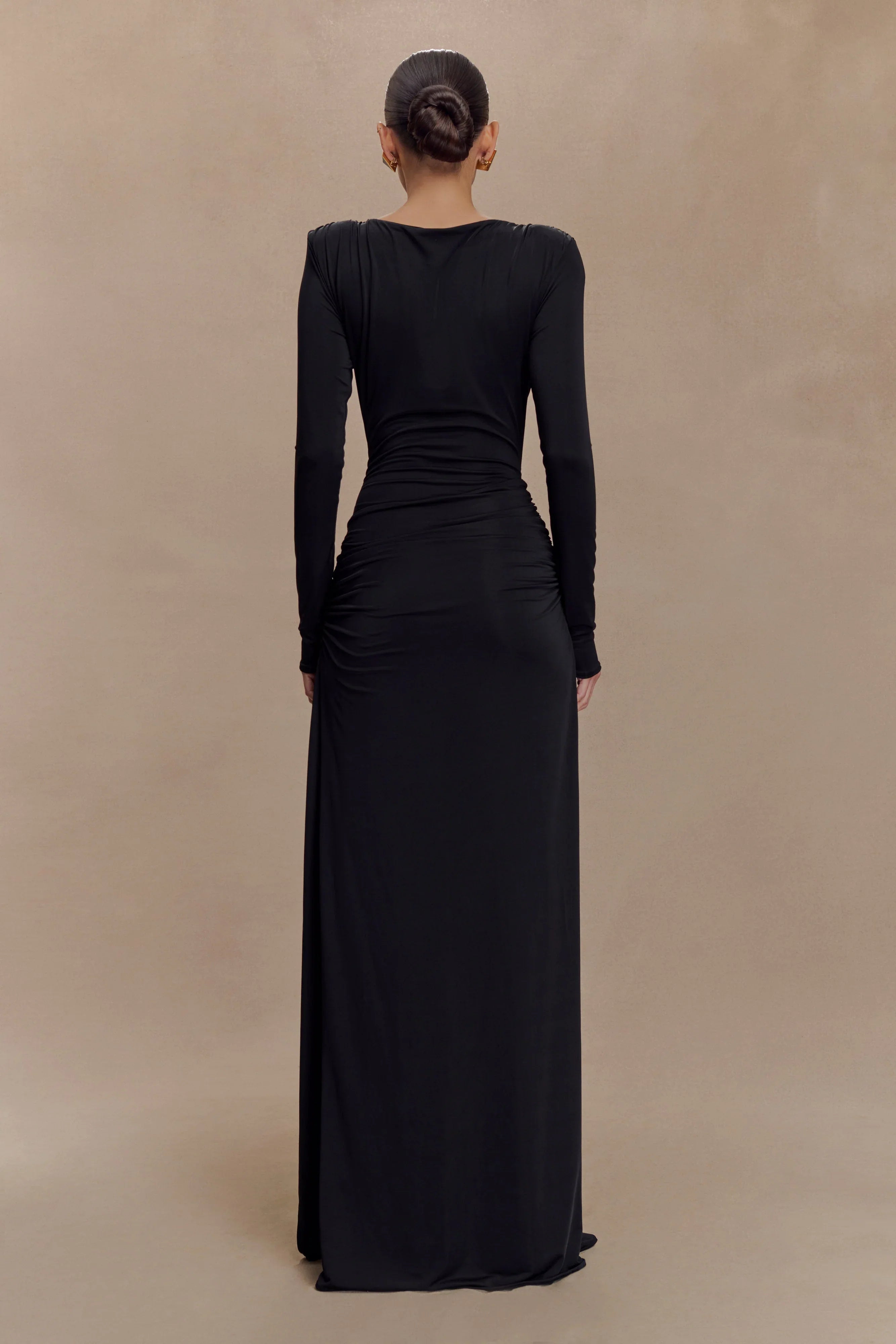 The DEANNA Long Sleeve Gathered Maxi Dress is a confident take on classic evening wear. Framed by a boat neckline and statement shoulder pads, this dress creates a bold yet feminine silhouette. Its bodycon fit is elevated with a front waist twist and gathered hip detail, designed to enhance and define. A thigh-high side split adds subtle drama, while the partially lined finish keeps the look sleek and sculptural. Perfect for nights that call for quiet power and polished allure.