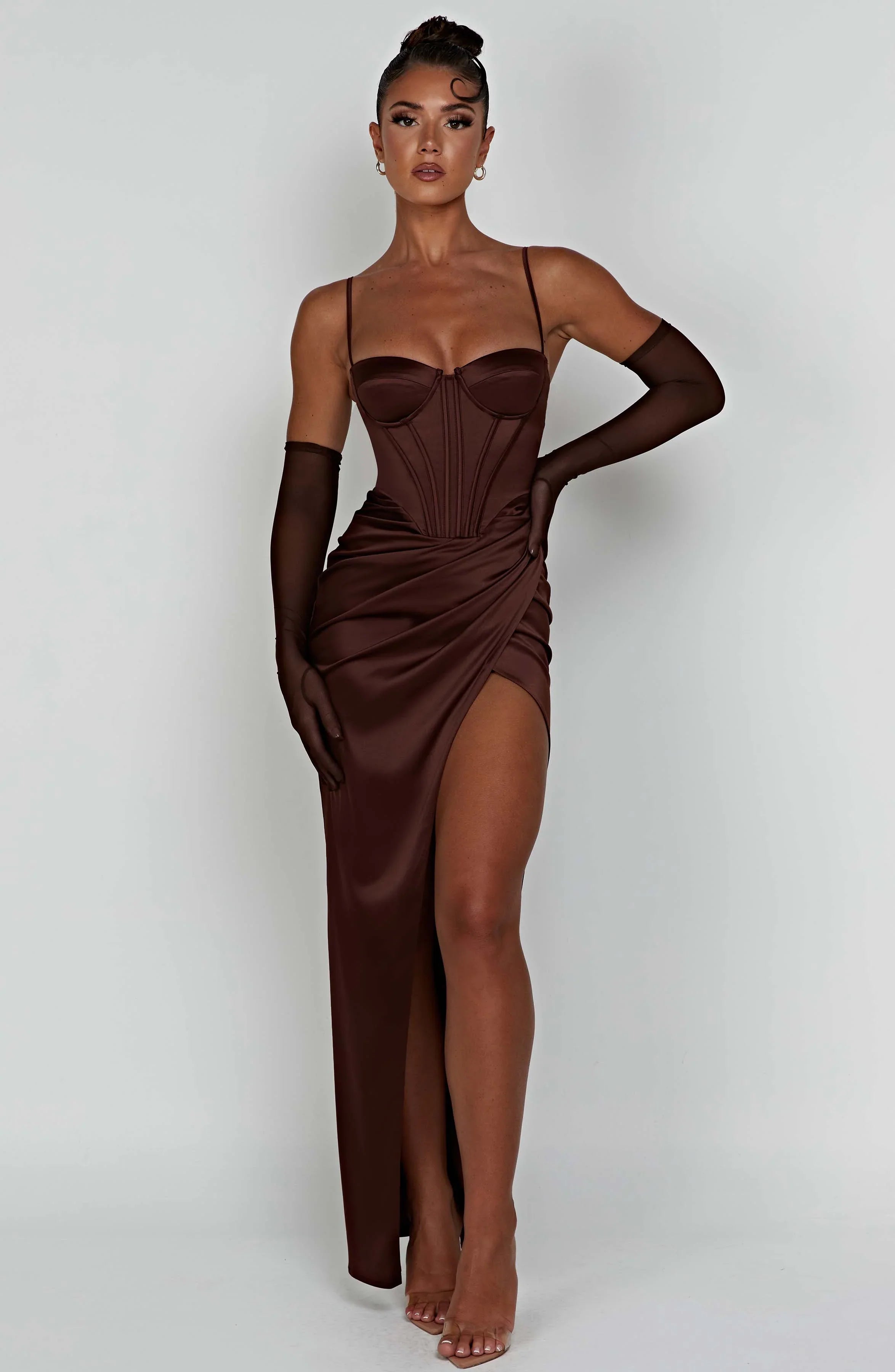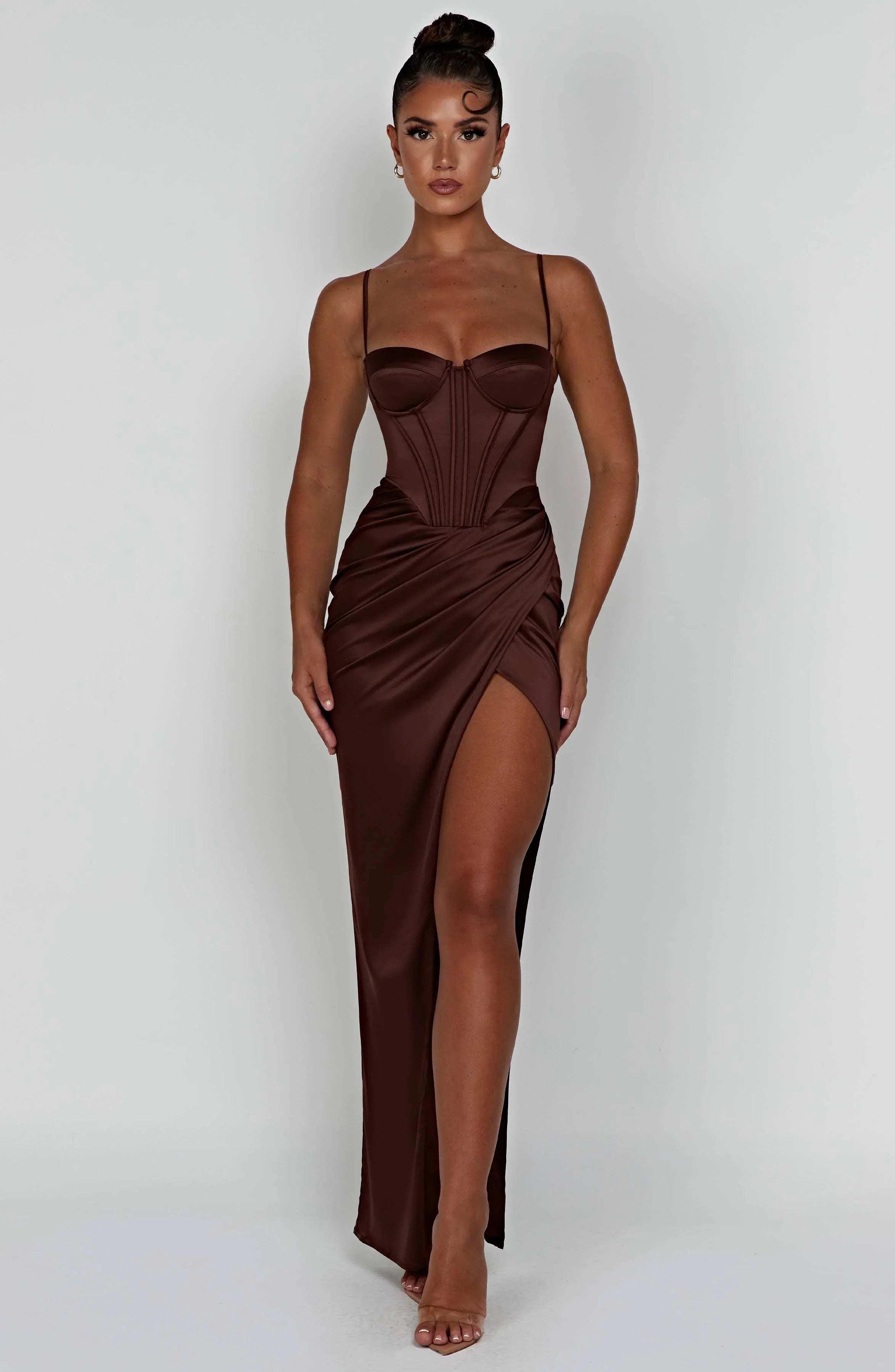 All attention, on you. The Despina maxi is a stunning choice for balls, formals, weddings and proms this season. Cut from luxury heavy satin with a stretch to skim over curves, this dreamy design is complete with a corset waist, thigh split, drape detail and underwired cups to lift and frame the bust. Style with glam waves and platforms.