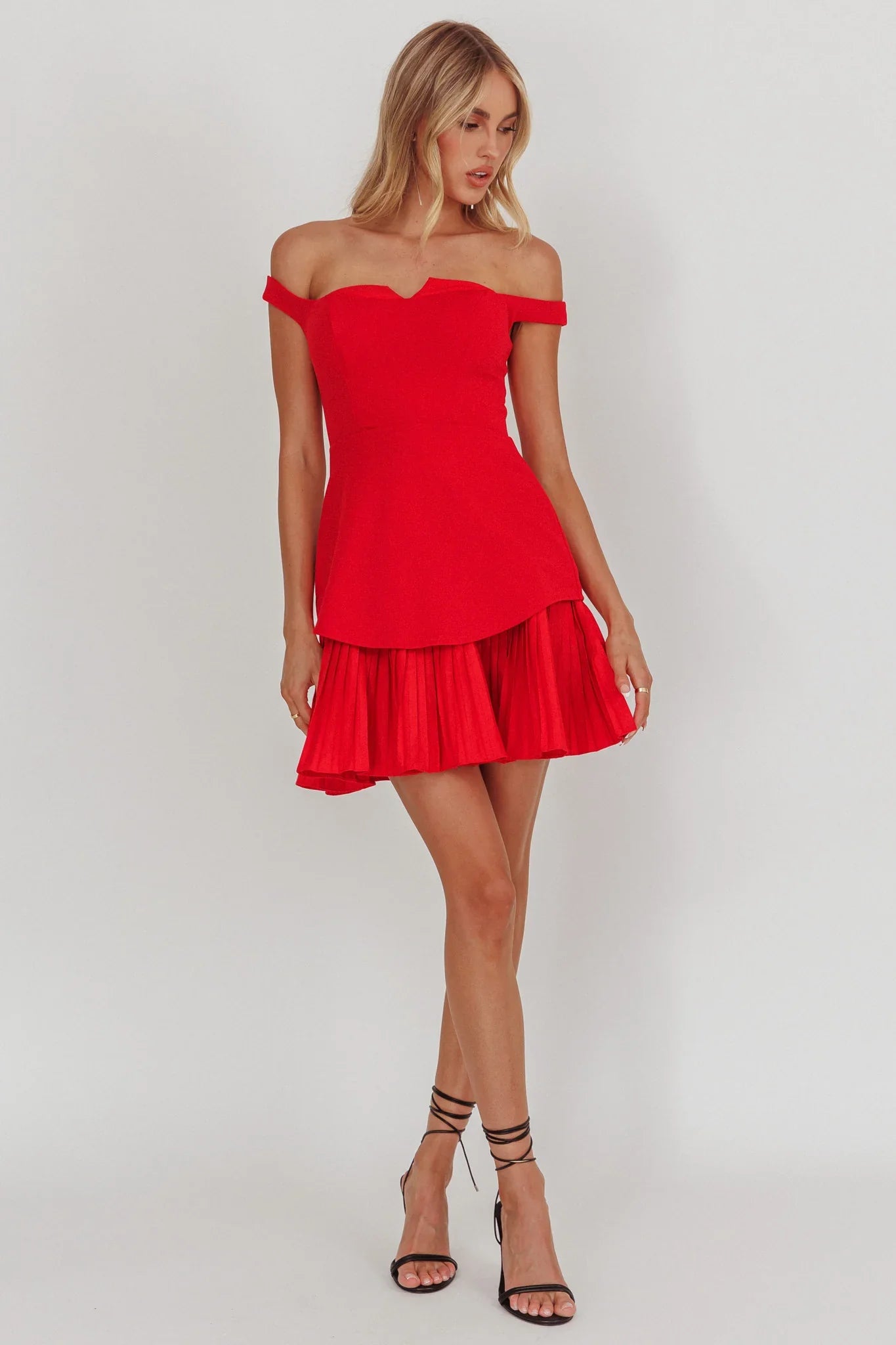 Make an entrance in our stunning Devoted Love mini dress. We love its flattering off-shoulder design and gorgeous accordion pleat detail in the skirt, perfect for twirling the night away! Team it with kitten heels and a saddle bag for a date night with your lover.
