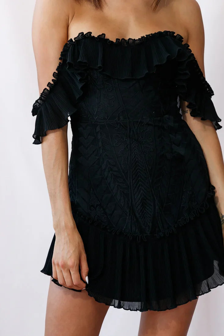 Stop whatever you are doing and take a moment to behold the beauty that is our Dreamy dress. Aptly named because, well, it's just downright DREAMY. The slight sweetheart neckline, the drapey off-shoulder, crêpe ruffle sleeves, the flirty ruffle hemline, this dress has it all! And how stunning is that embroidery throughout the torso? Heaven! Pair it with simple nude heels because this dress is already perfection.
