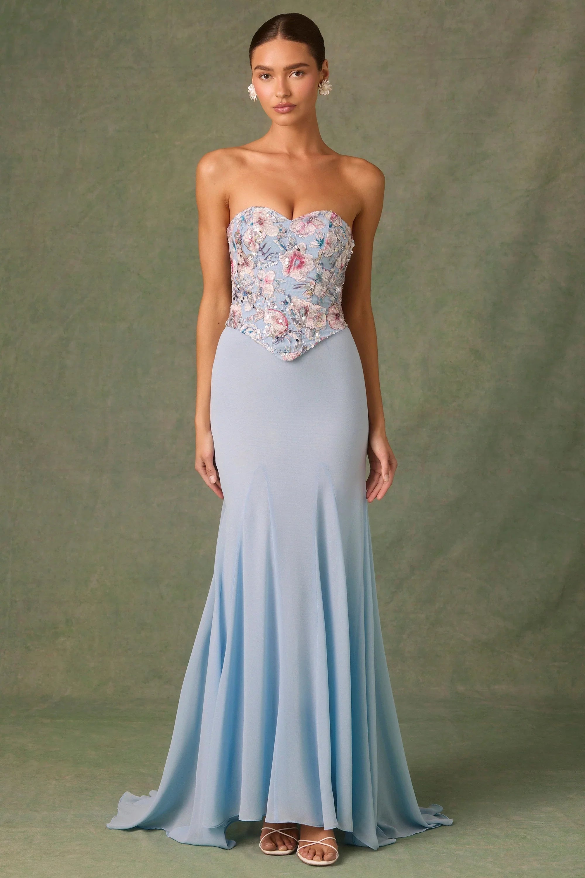 Divinely crafted. Spotted on the runway first, the Lysana gown is designed for extra-special occasions and features a fully embellished corset bodice overlaid with watercolour-inspired custom floral appliqués brought to life with sparkling sequin embellishments. It features a floor-skimming chiffon skirt with godet pleats for dynamic movement and is complete with signature lace-up detailing at the back that can be adjusted for your perfect fit.