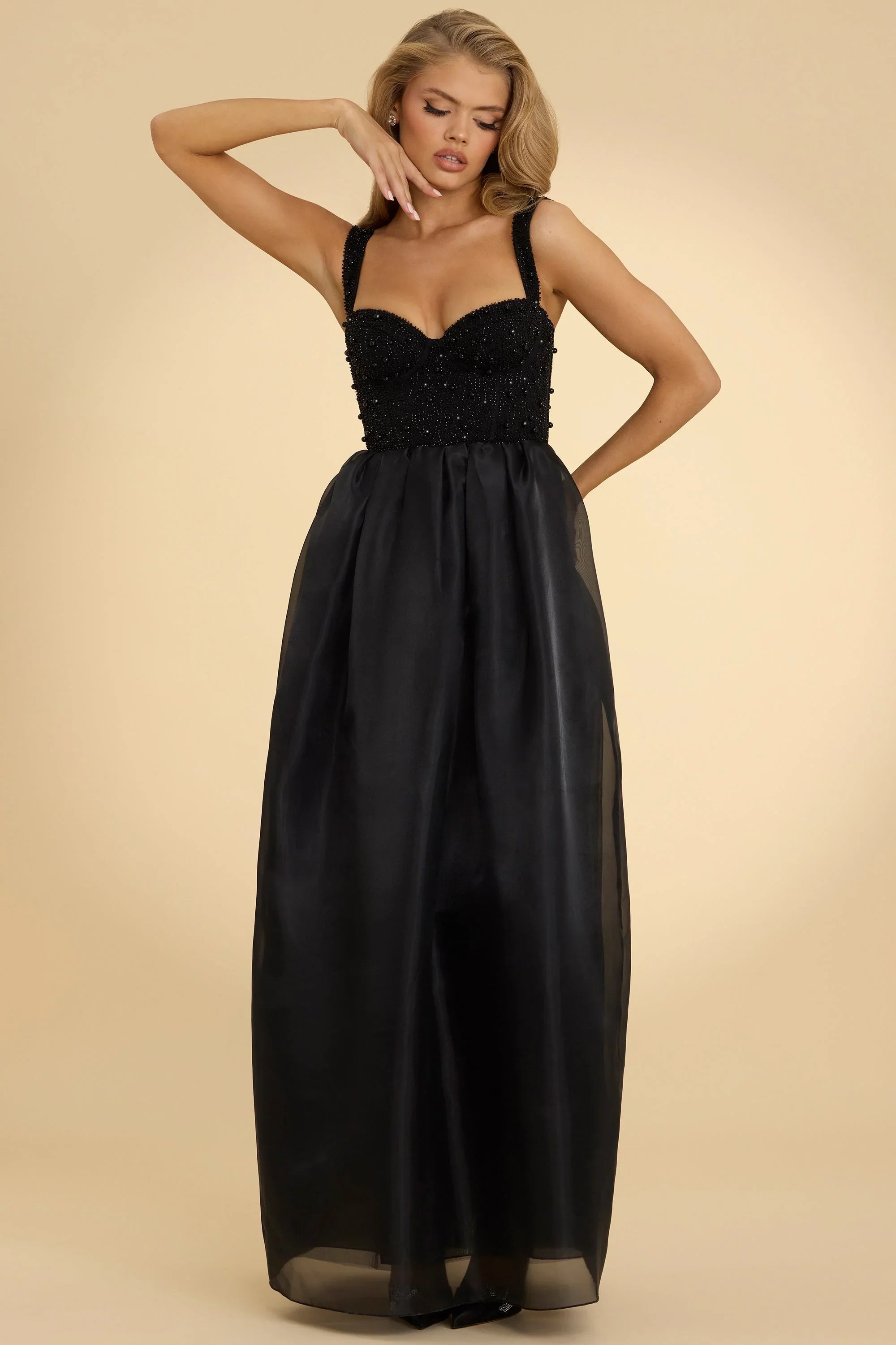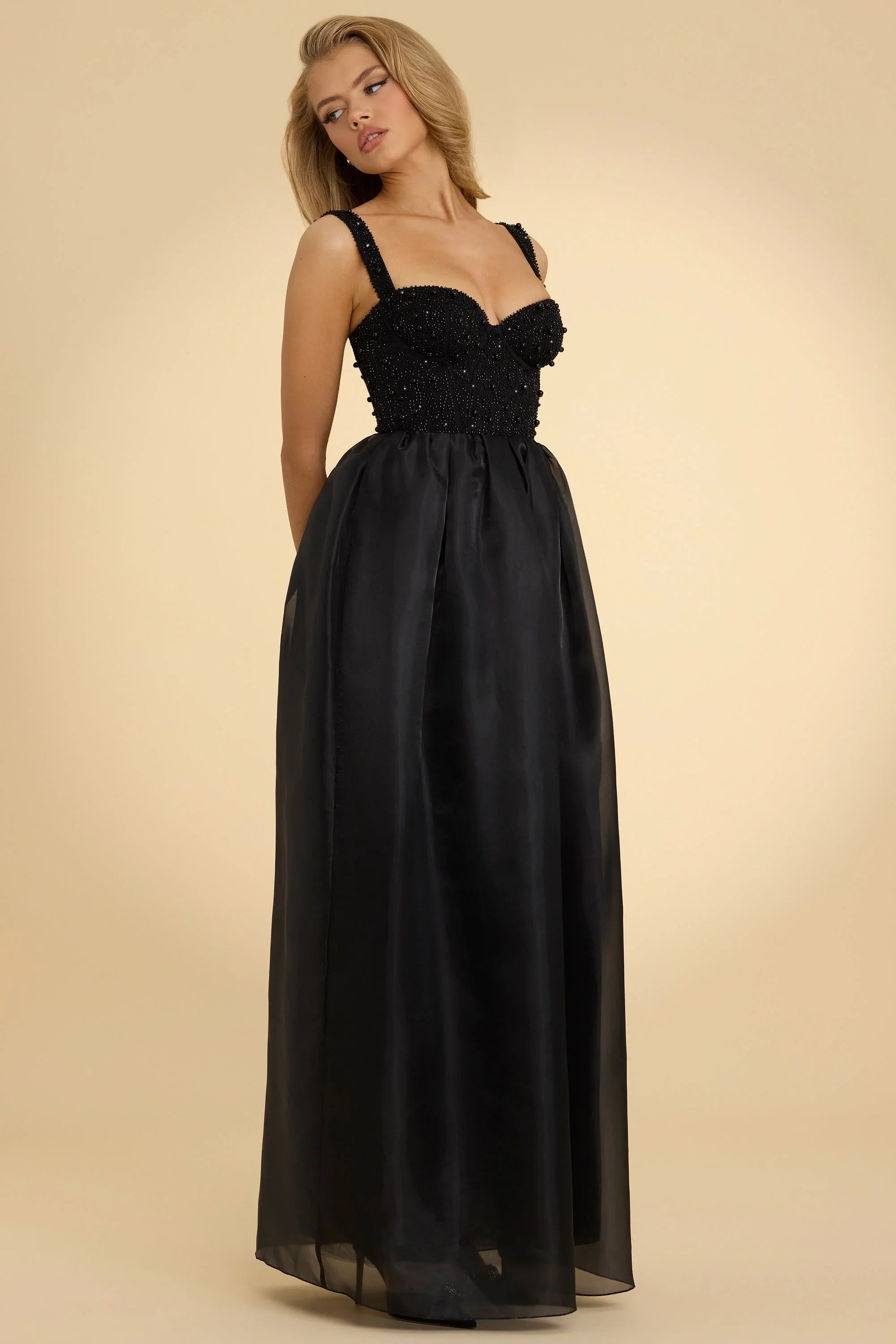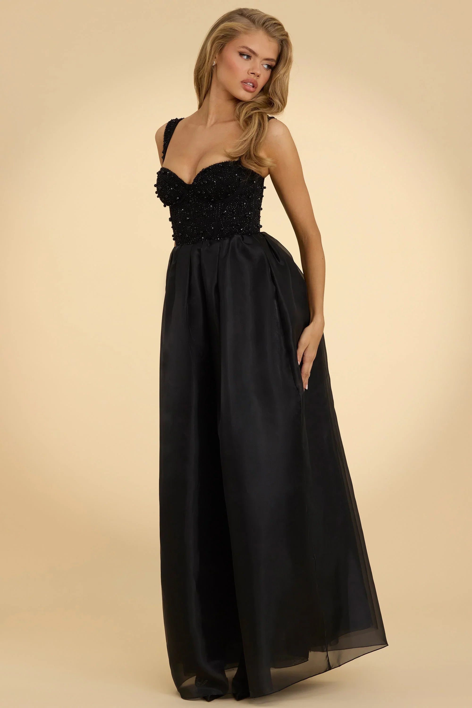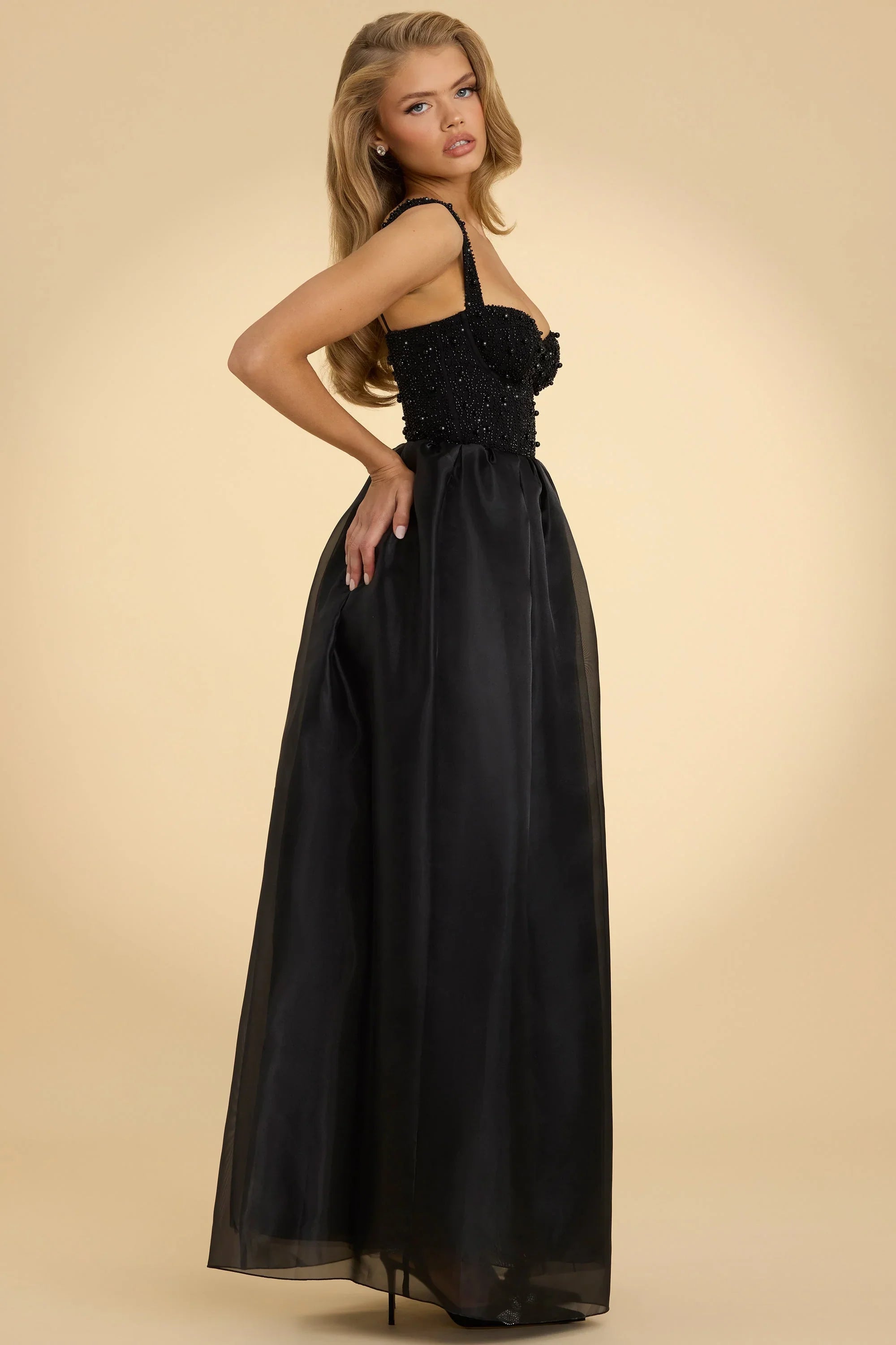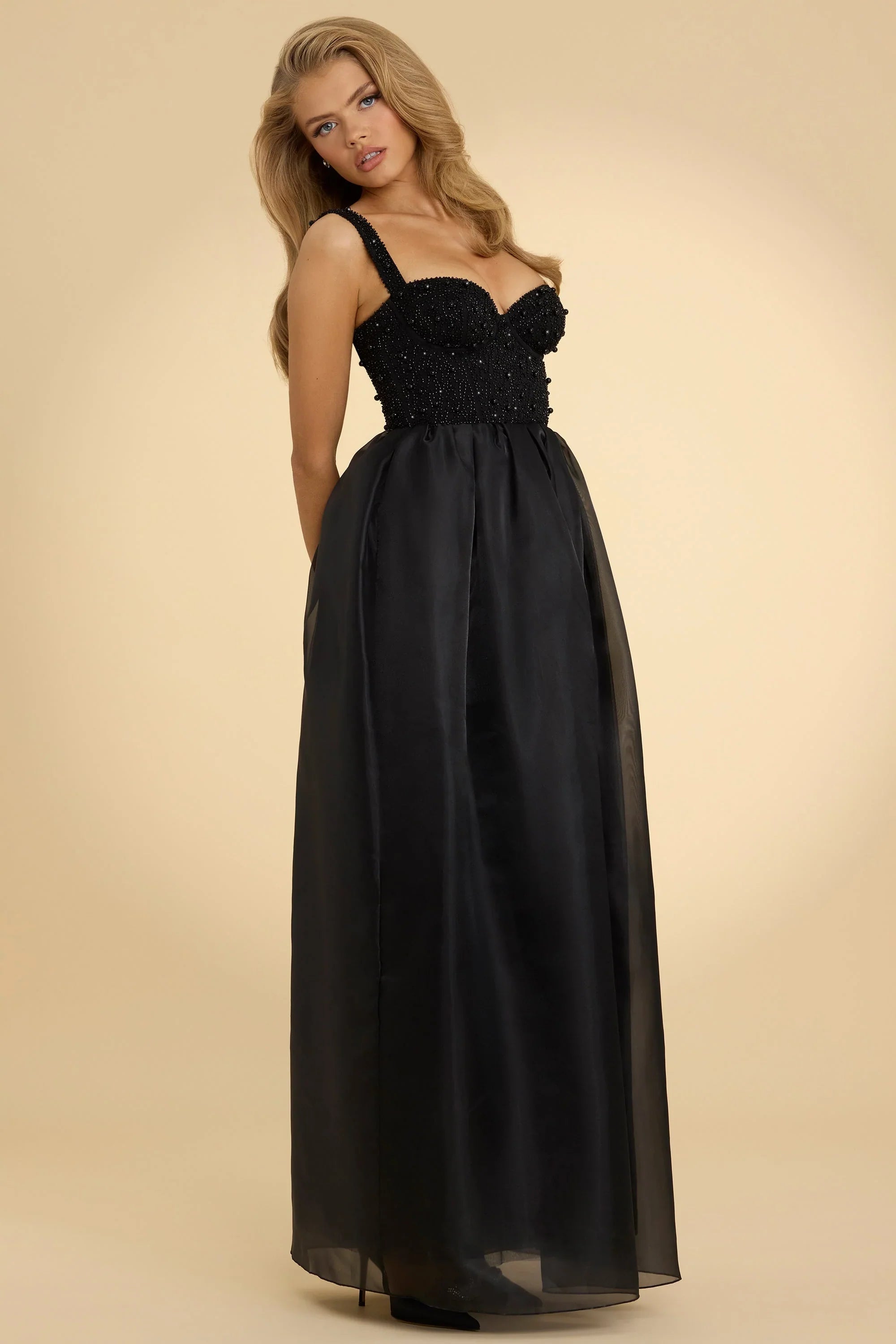 For nights you’ll never forget. Designed for your special events, the Delancey gown features a premium mesh corset for enhanced support, elevated with hand-finished bead and pearl embellishments that sparkle under spotlights. It’s cut to a dramatic maxi length with a voluminous organza skirt and is complete with adjustable tapered shoulder straps for your perfect fit.
