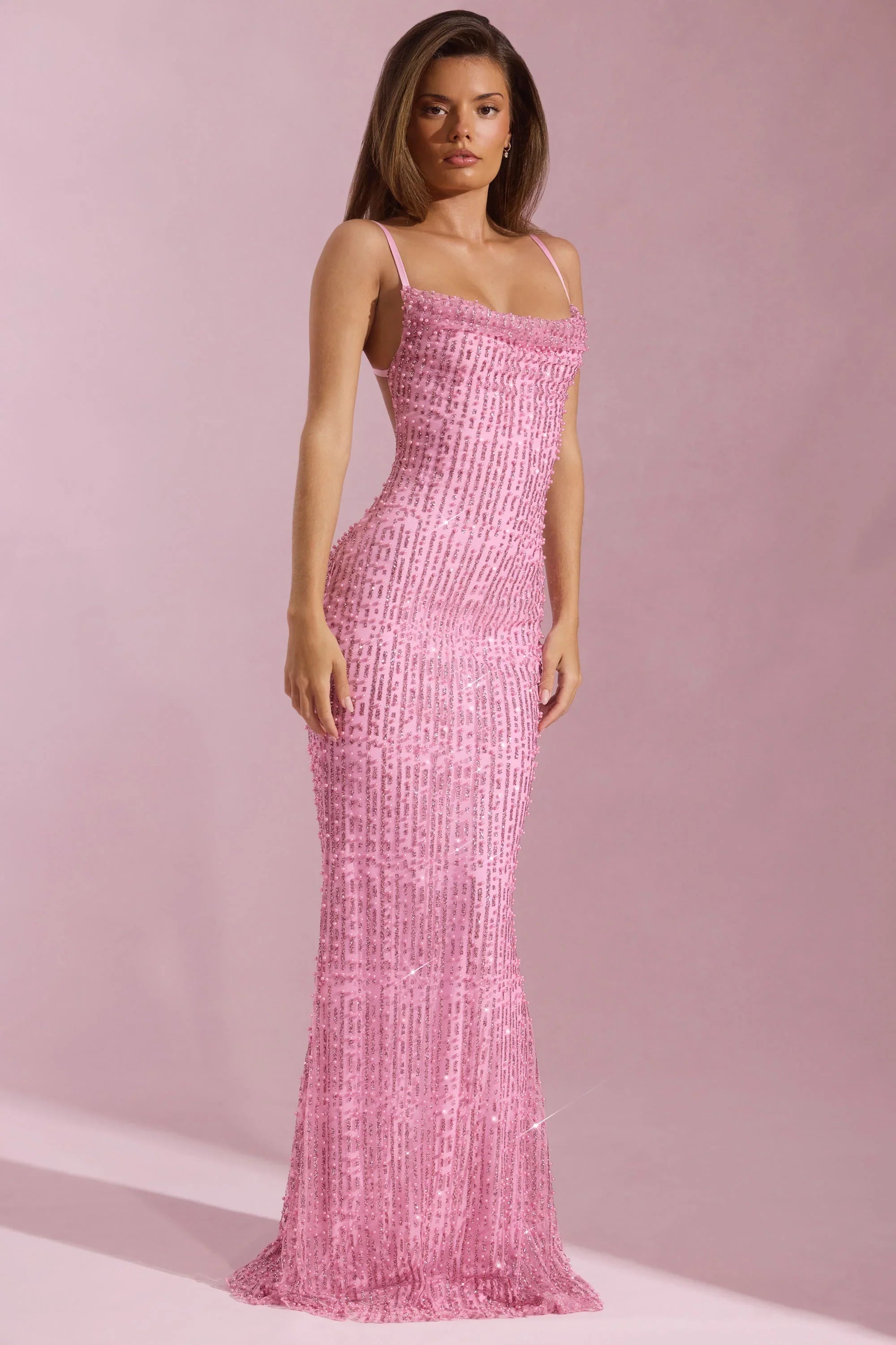 Iconic sparkle. Capturing attention from every angle, the Nivalis maxi dress is crafted from our premium, lightweight glittered mesh fabric overlaid with faceted three-dimensional beads and fully lined for the perfect amount of coverage. Its framed with a cowl neckline and statement open back with adjustable straps for the perfect fit.