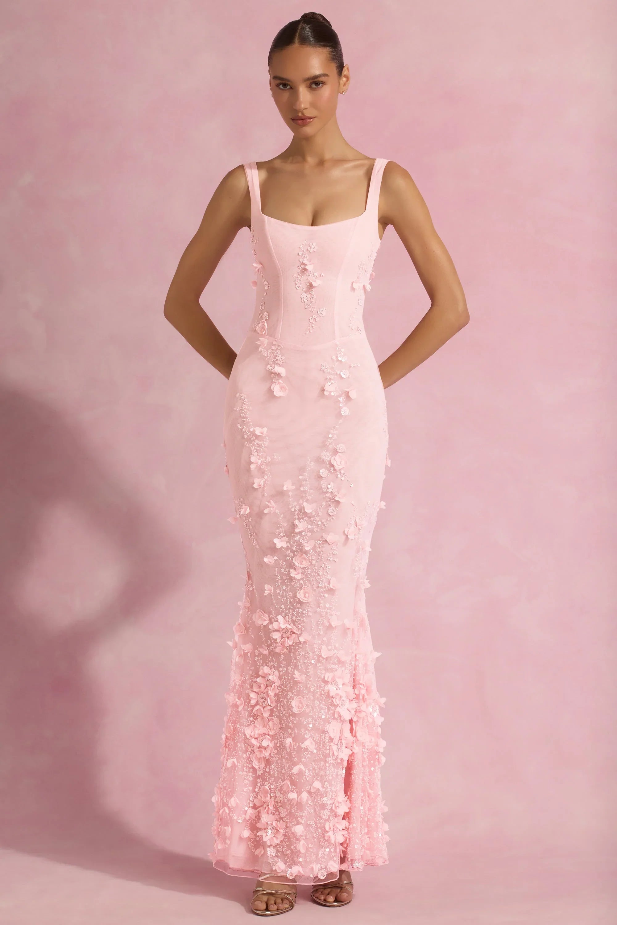Wearable works of art for your most special occasions, the Vasanta gown is adorned with delicate tonal floral appliqués brought to life with perfectly placed sequin embellishments. It’s crafted from lightweight, semi-sheer premium mesh that hugs your curves and is lined with signature power mesh for a non-restrictive sculpting effect. It’s cut to a classic fishtail silhouette with lace-up detailing at the back and adjustable straps for your perfect level of support.