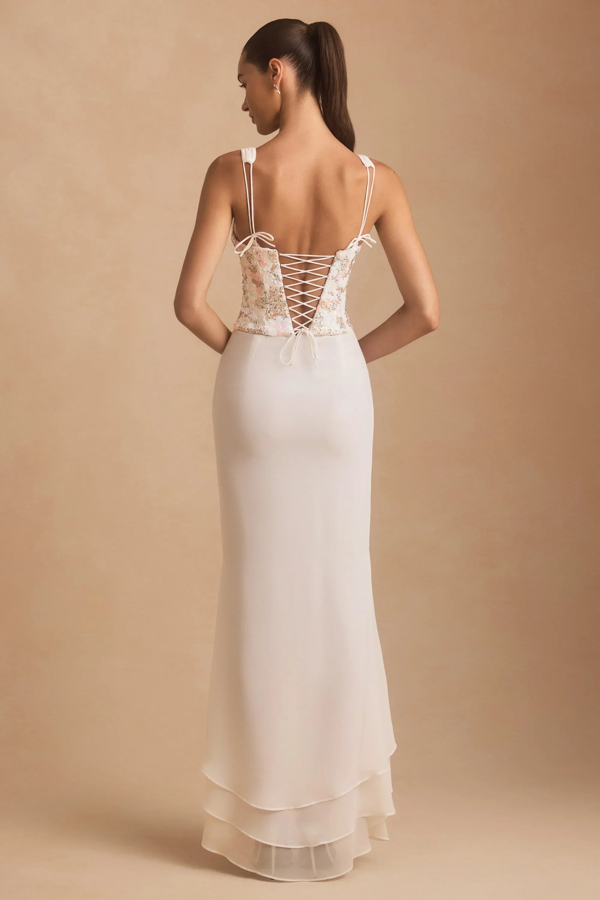 Worth making plans for, the Nathalia maxi dress is cut from lightweight chiffon with a plunging V-neckline, waterfall split hem and statement lace-up back. Its overlaid with a waist-cinching corset decorated with coral-inspired embellishments that sparkle under spotlights. The rouleau straps are fully adjustable for your perfect fit.