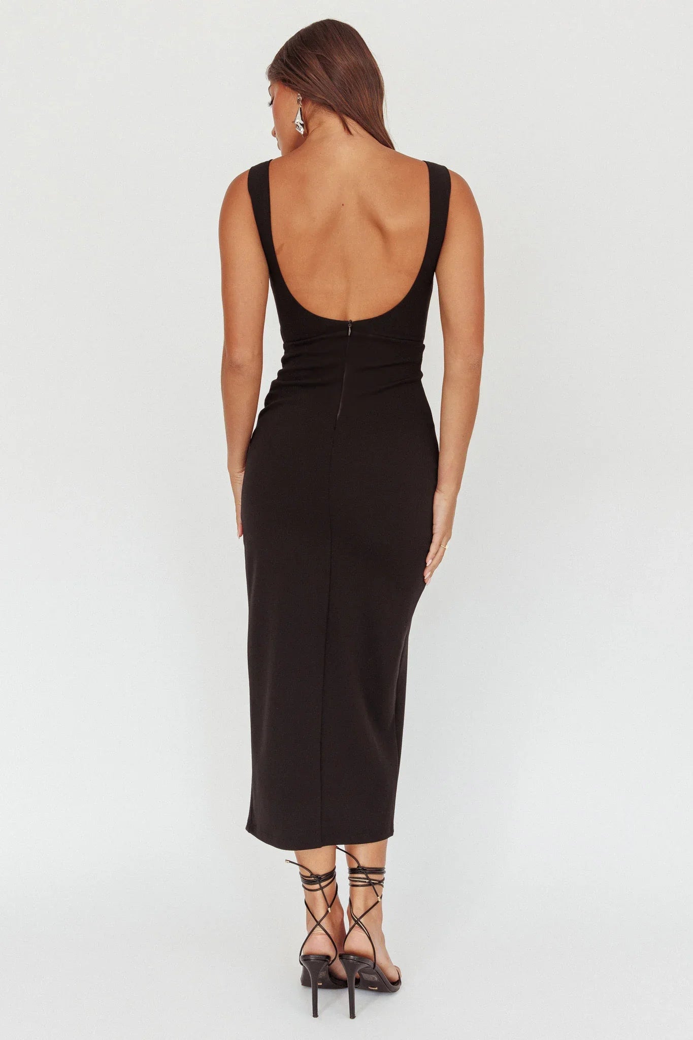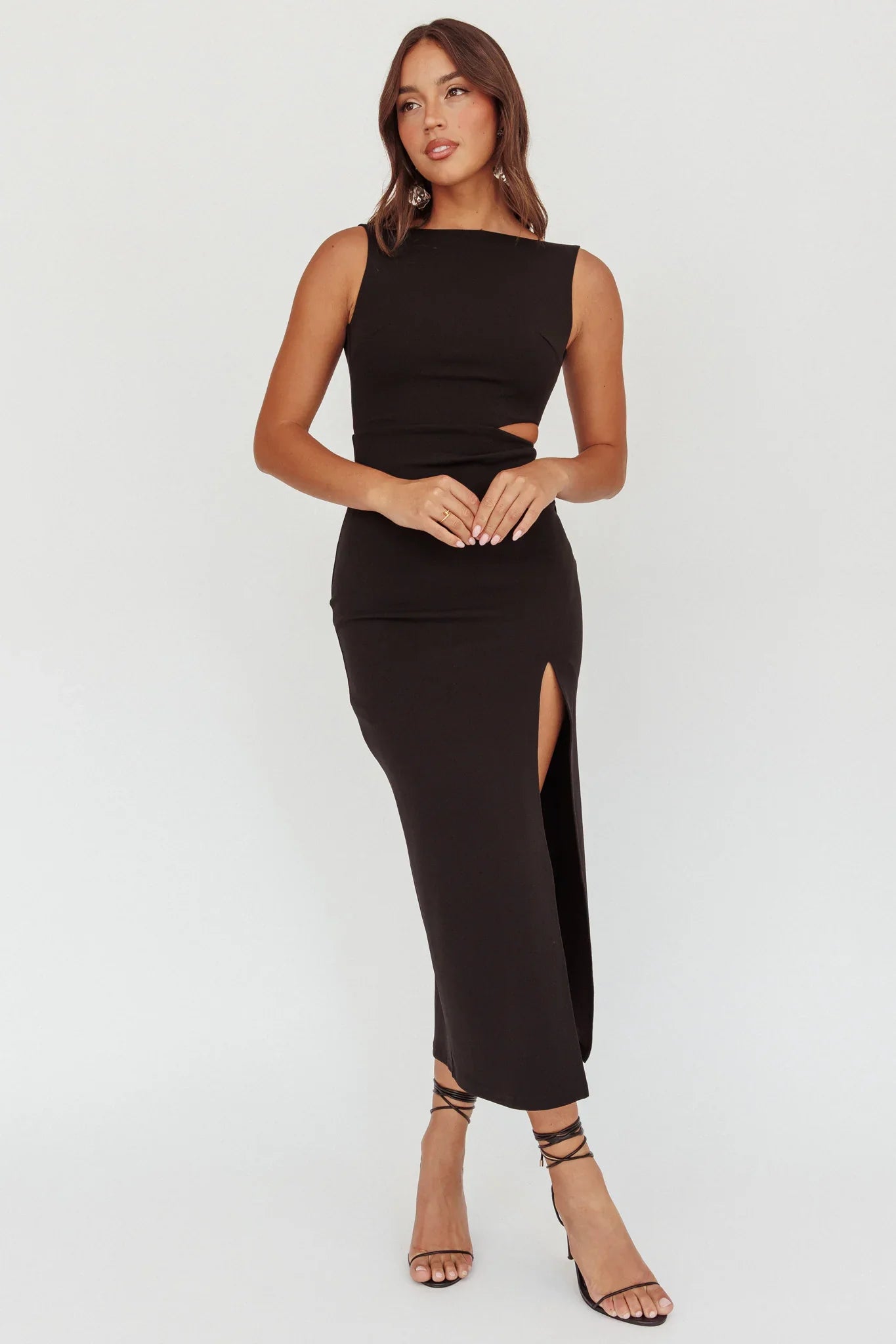 Make them stop and stare in our elegant Emille midi dress. It features a cut-out waist and thigh-high split. It's perfect for a wedding or special event! Team it with strappy heels and a purse for a gorgeous look.