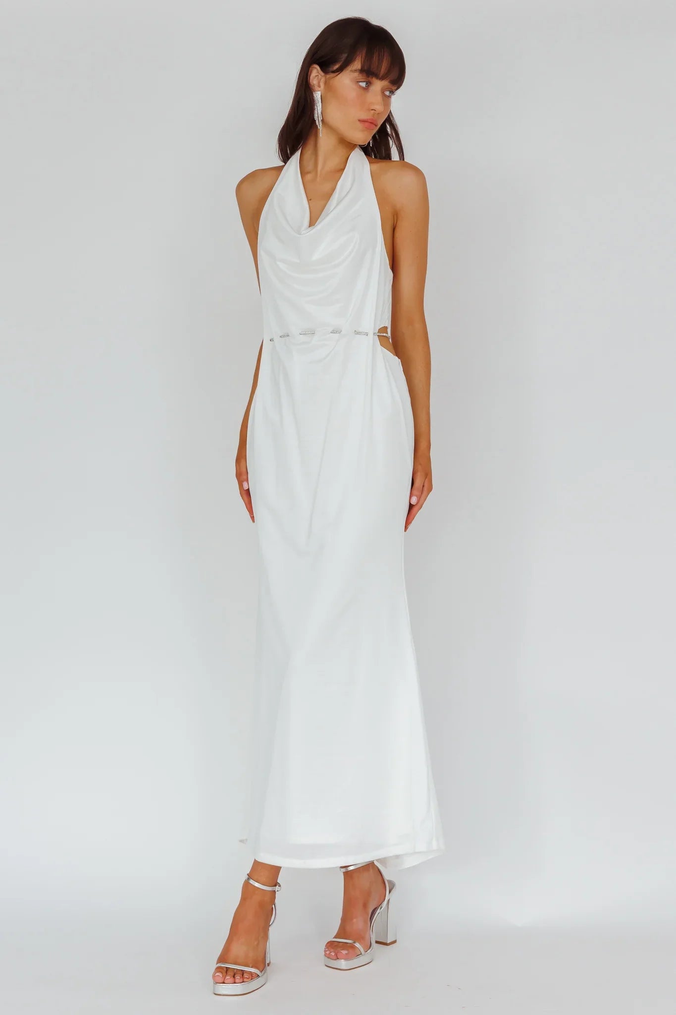 Steal the show in our gorgeous Emmi midi dress. We are obsessed with its chic cowl neck and diamante rope tie in the waist. Perfect for bridal events or a special occasion. Team it with strappy, white heels and a clutch for an unforgettable look.