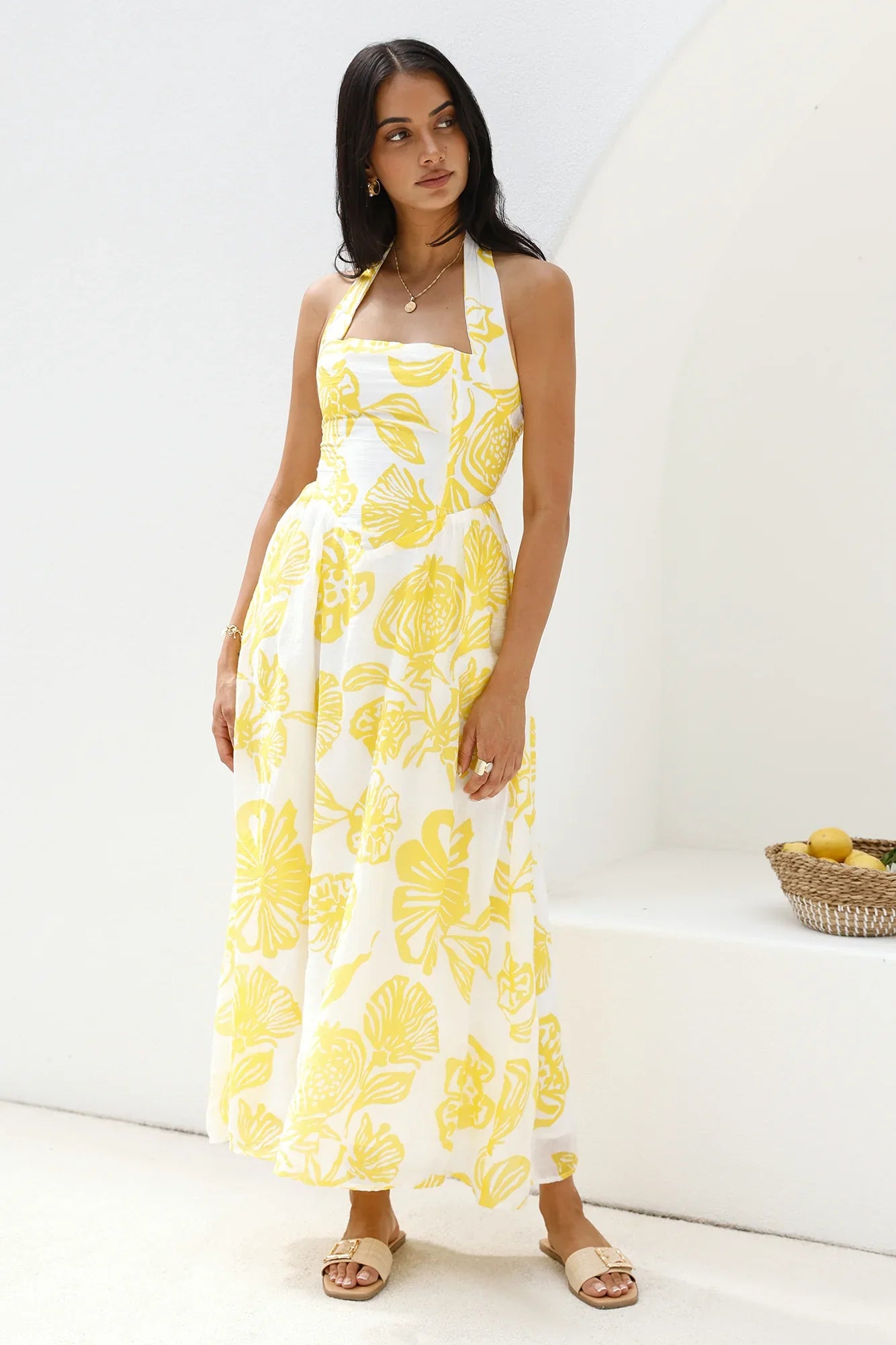 Bask in the glow of sun-drenched days with the Eternal Spring Maxi Dress in Yellow. This effortlessly chic dress features a striking yellow floral print against a breezy white backdrop, evoking the warmth of summer escapes. Designed with a flattering halter neckline and a structured bodice, it cinches at the waist before flowing into a dreamy, lightweight maxi skirt. Whether wandering through a coastal market or sipping cocktails at sunset, this piece radiates carefree elegance with every step.