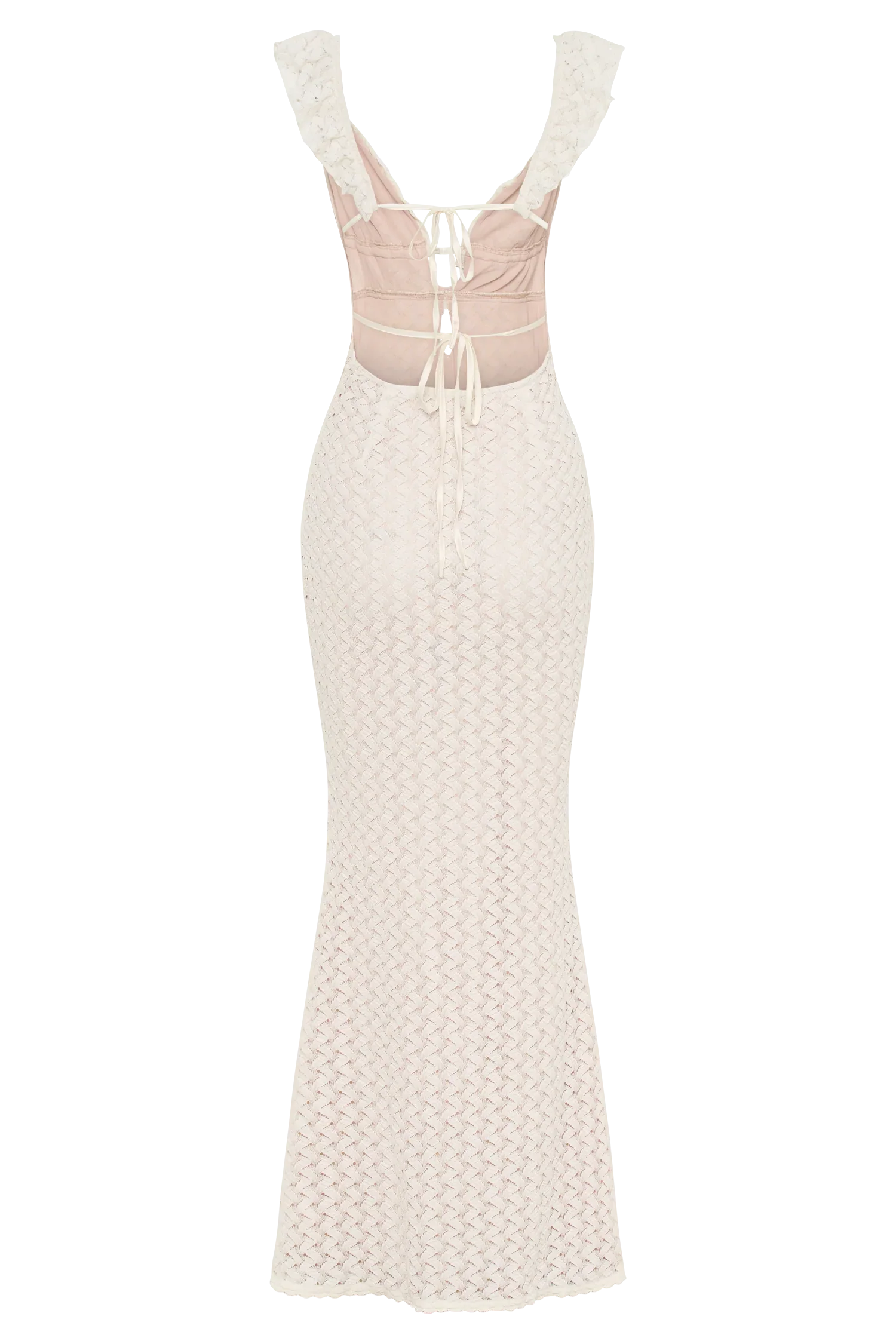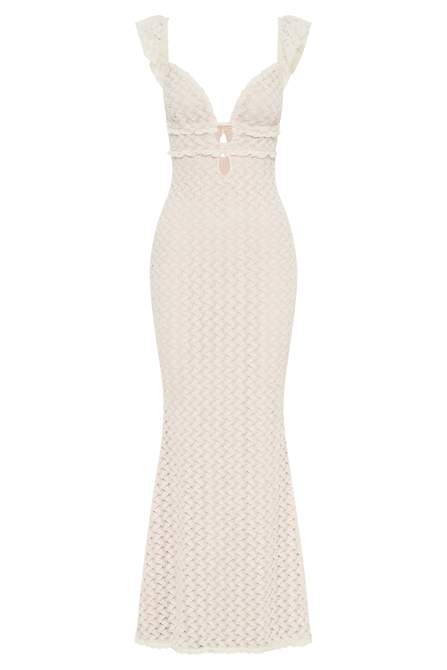 Indulge in the chic allure of the EZRA Knit Maxi Dress, a captivating piece that effortlessly blends comfort and style. The V neckline and flutter sleeves add a touch of femininity, creating a flattering silhouette. Self-ties at the back allow for a personalised fit, while the centre front keyhole adds a hint of intrigue. The dress boasts a patterned knit that exudes modern charm, and being unlined knitwear, it provides a breathable and relaxed feel.