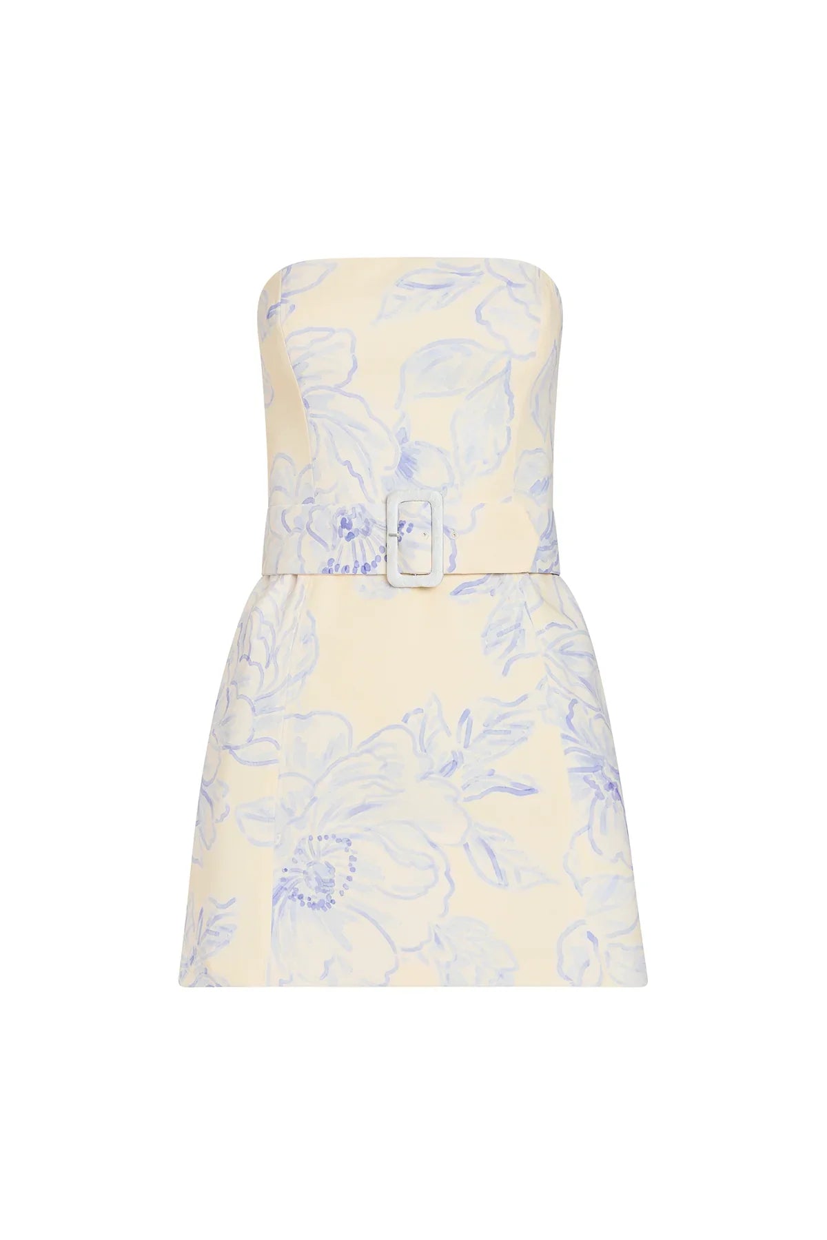 Refine your wardrobe with the Fae Dress. This strapless mini features a bold belt and a delicate print, balancing sharp lines with a soft finish. Add heeled mules and gold jewelry for a sweet summer look.