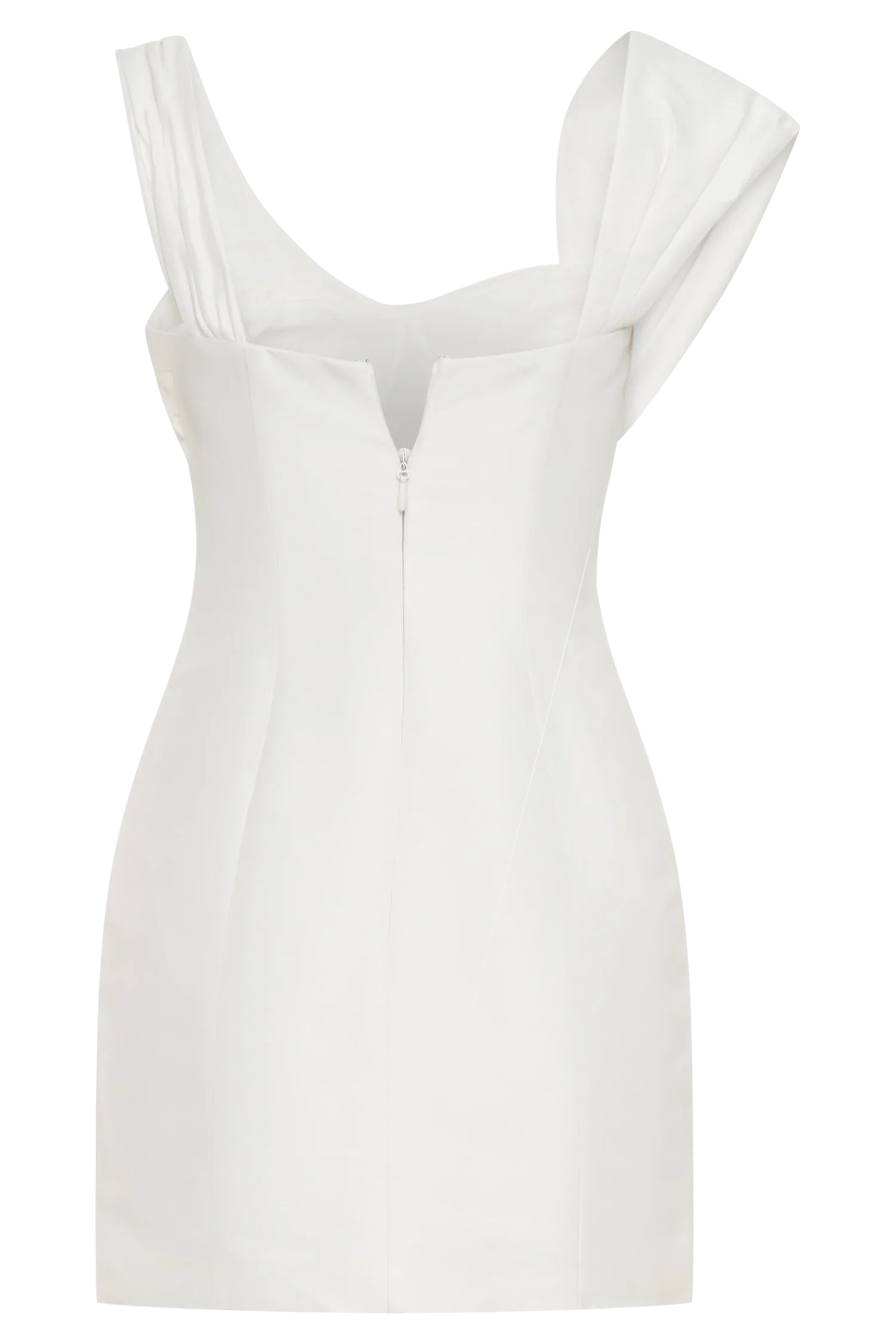 The FARRAH Structured Draped Mini Dress is a bold and stylish choice for any occasion. Featuring an asymmetrical neckline and unique rippling and panel detailing, this mini dress creates a striking silhouette. The cinched waist accentuates your figure, while the centre back zip ensures a perfect fit. With its mini length, the Farrah dress offers a modern and sophisticated look, perfect for making a fashion statement.