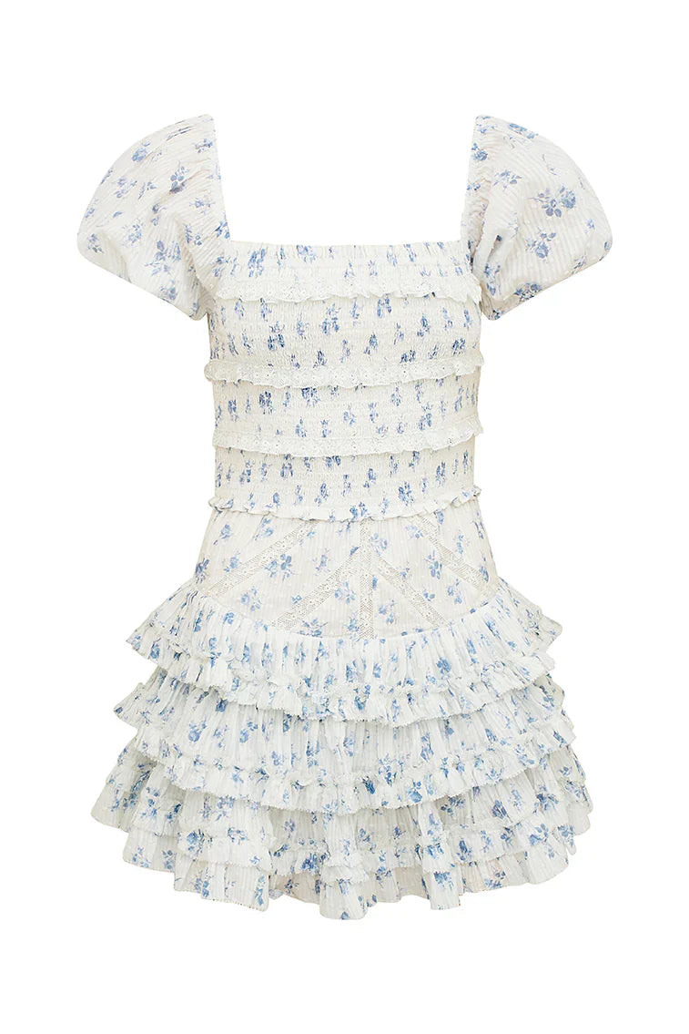 Feeling dreamy in the Fellows Dress. This Victorian-inspired mini features a striped cotton dobby fabric with tiny swiss dots interwoven all over for a textural and vintage-inspired feel. Featuring our new heirloom floral print, this pieces begins with short puff sleeves with elastication at the openings for comfort, a square neckline that flows to a smocked bodice with horizontal laces stripped throughout, followed by a fitted waist that releases into a flirty skirt.