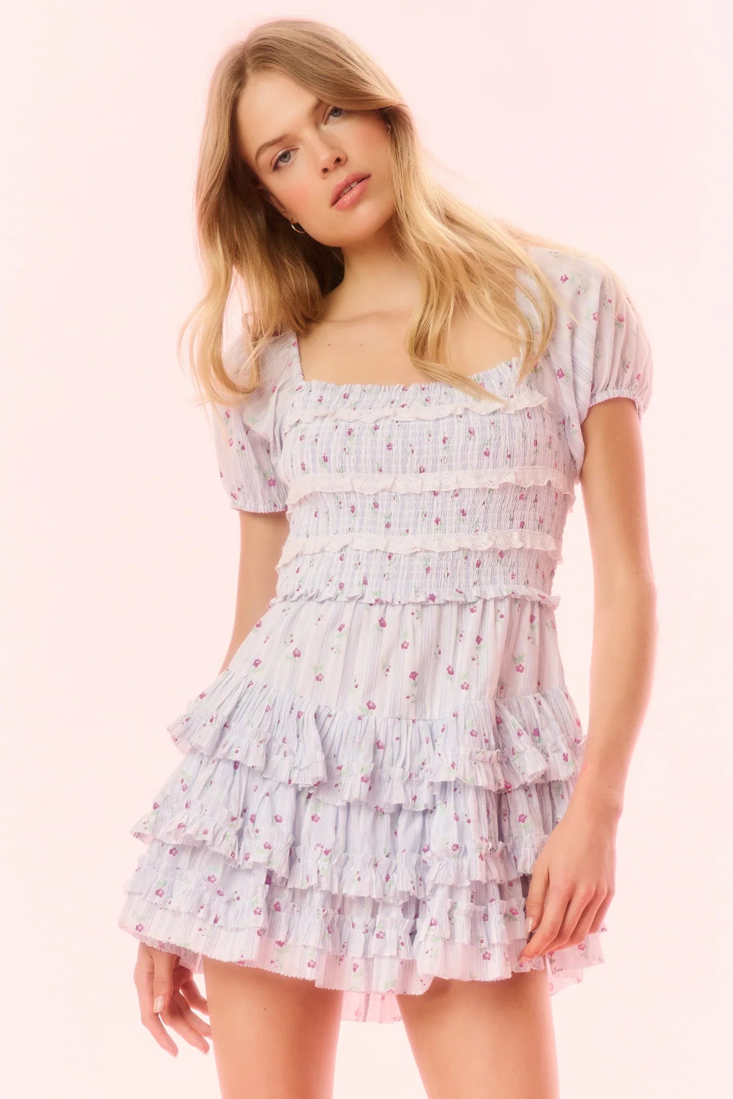 Feeling dreamy in the Fellows Dress. This Victorian-inspired mini features a striped cotton voile fabric featuring a ditsy floral print all over. This piece begins with short puff sleeves with elastication at the openings for comfort, a square neckline that flows to a smocked bodice with horizontal laces stripped throughout, followed by a fitted waist that releases into a flirty skirt.