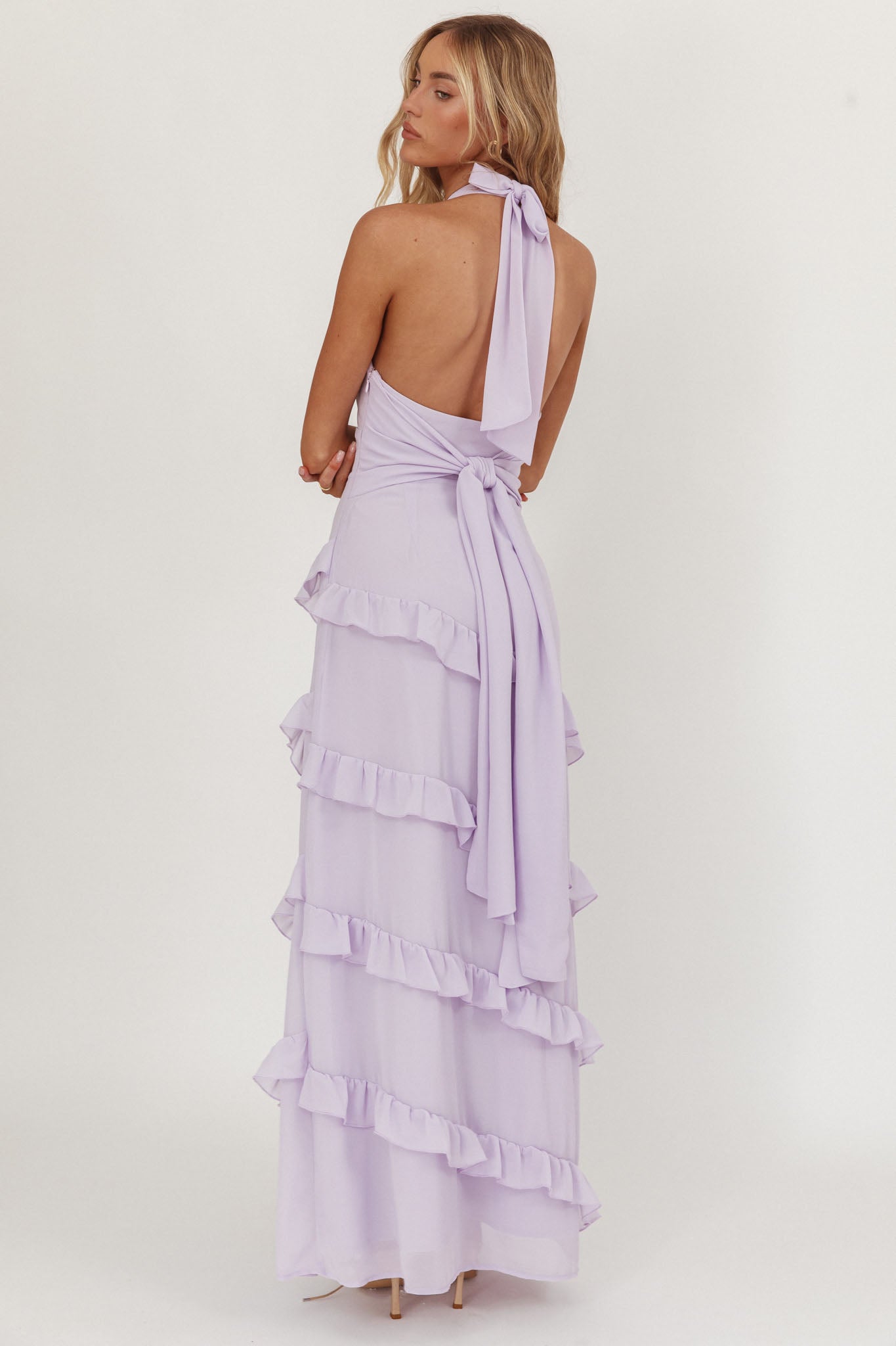 You will steal the limelight in our stunning Flirt maxi dress. Featuring a halter neckline and a feminine frill trim, it's perfect for a birthday celebration or special event. Team it with strappy, nude heels and a purse for a head-turning look.