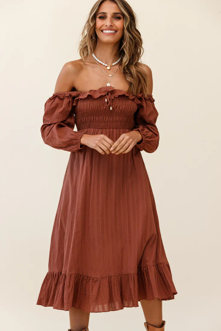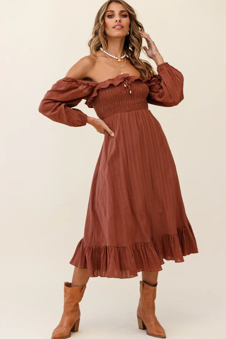 Channel your inner boho babe in our super cute Flynn midi dress. Featuring an off-shoulder style, frill trim, shirred bust and flounce hem. Perfect for a country music festival with your southern gentleman teamed with cowgirl boots and a slouchy tote.