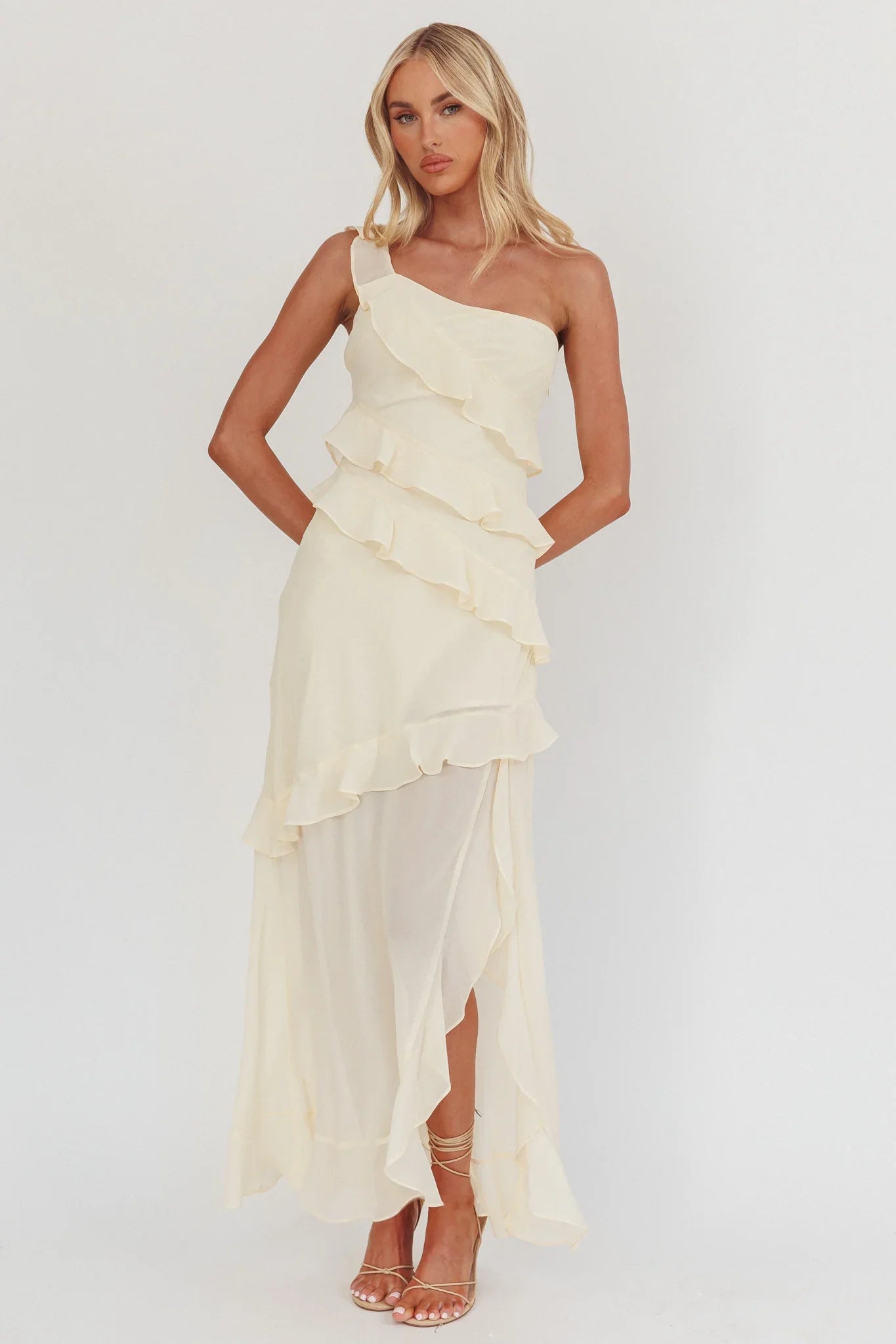 Jaws will drop when you walk in wearing our stunning Gelina maxi dress. It features an on-trend, one-shoulder design and frill trim throughout. Wear it to a wedding or special event teamed with strappy heels and a purse for a look that will turn heads.