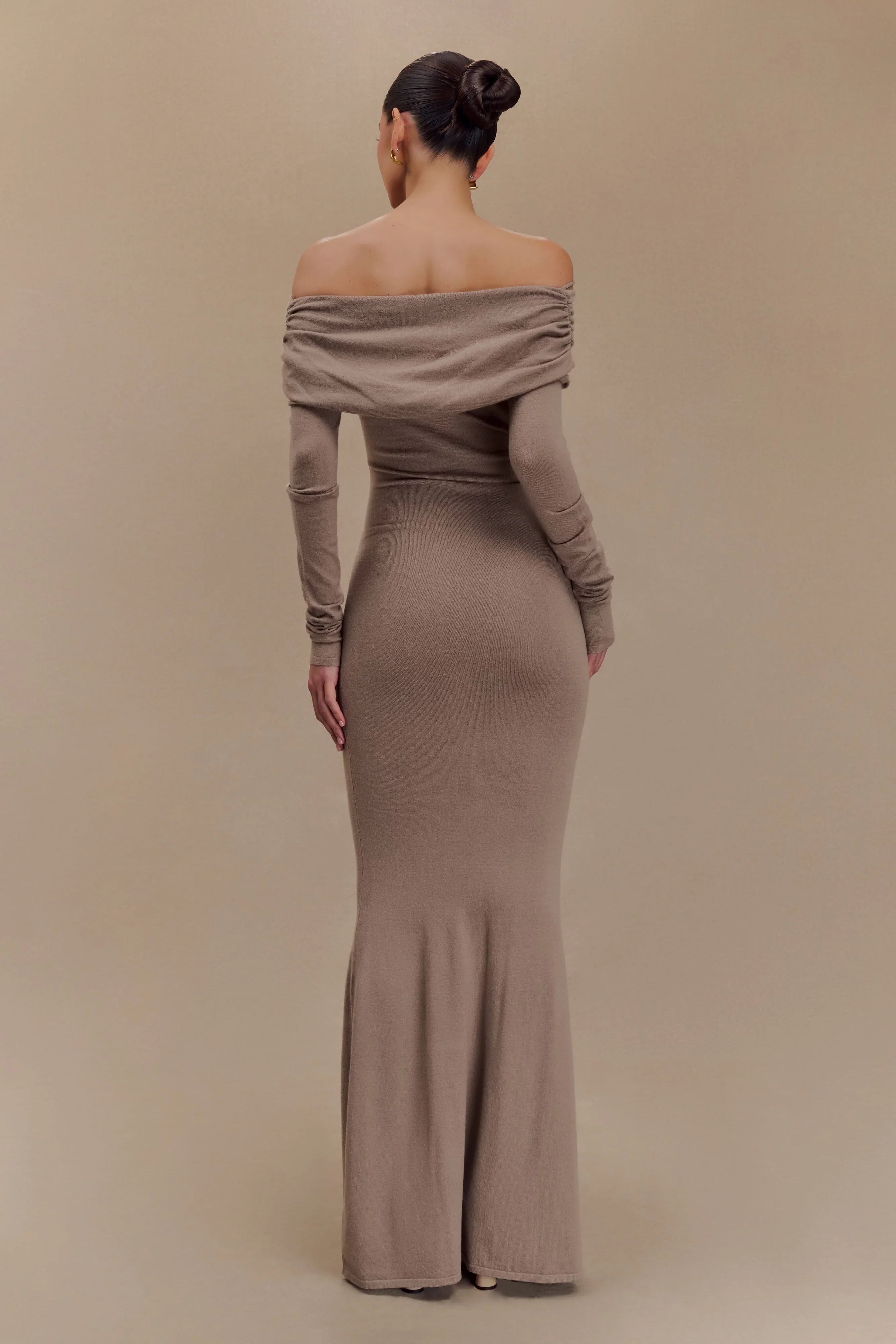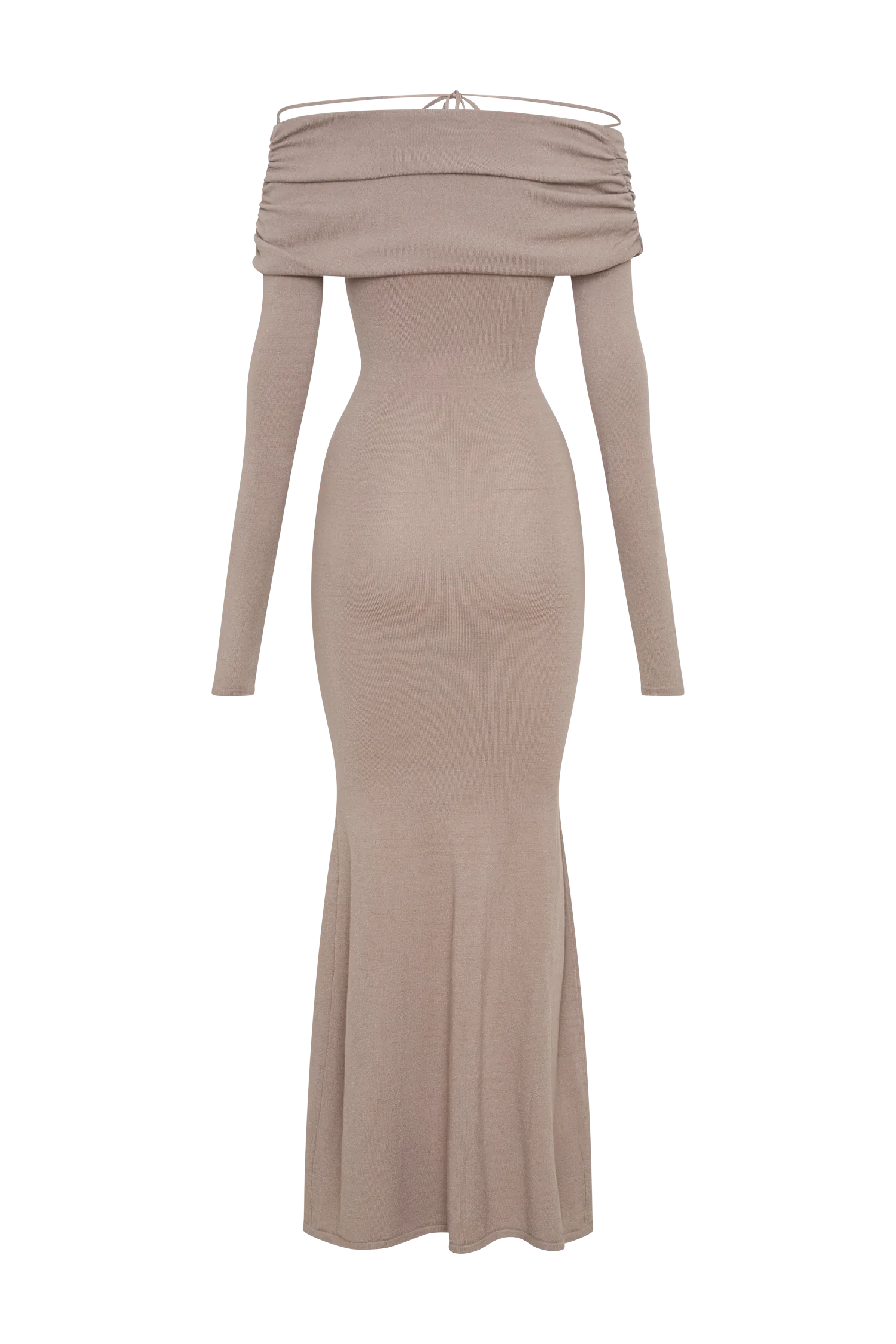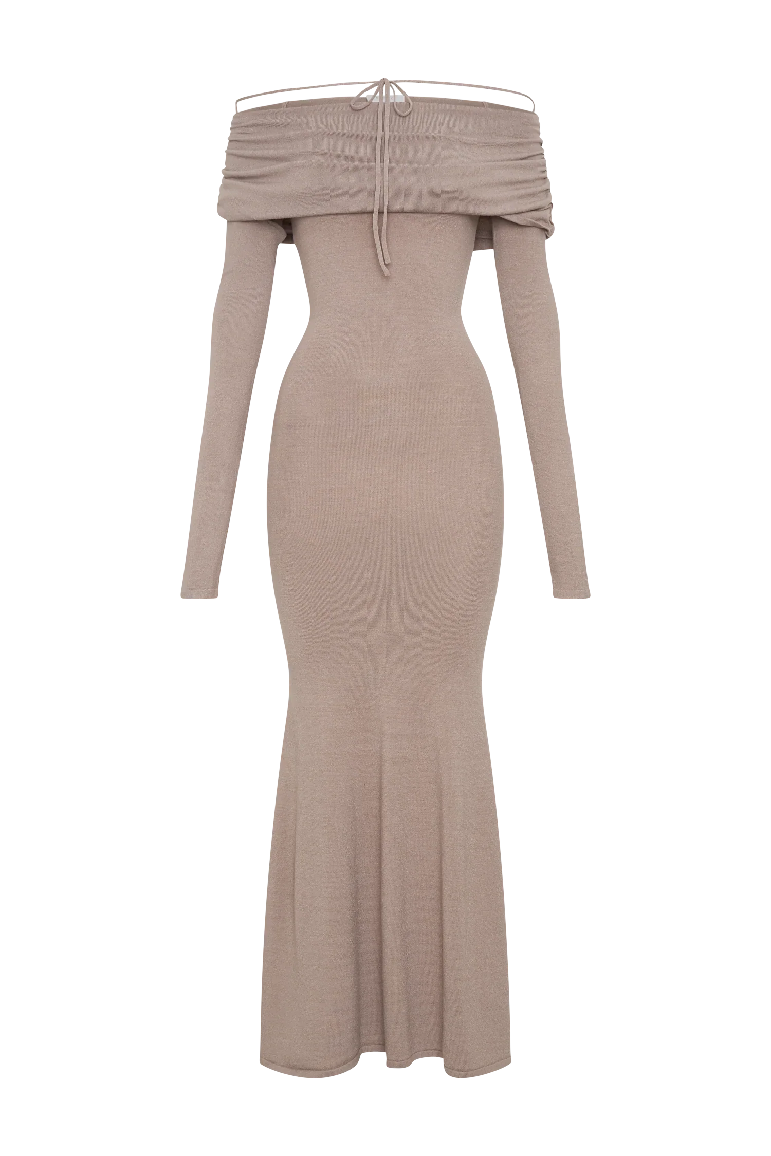 Elevate your wardrobe with the GEORGIANA Off Shoulder Knit Midi Dress, featuring a chic Bardot neckline and long sleeves that beautifully frame your shoulders. The bodycon fit and ruched overlay create a flattering silhouette, while the scooped front neckline and centre front shoulder tie add stylish details. Flowing into a fishtail hem shape, this midi-length dress exudes sophistication, making it perfect for any occasion. Pair it with strappy heels for a captivating look.