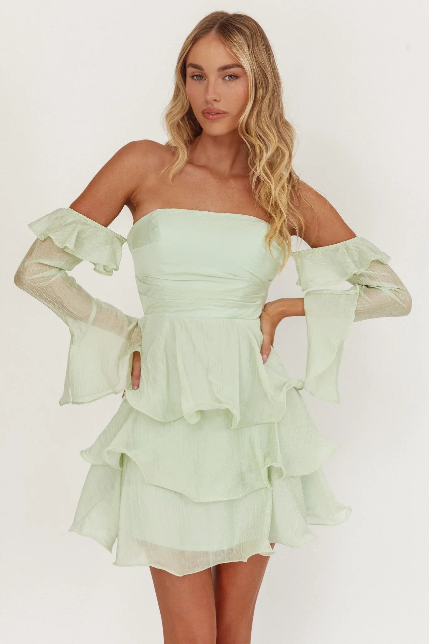 Make an entrance in our stunning Giavana mini dress. It features off-shoulder long sleeves and tiered layers throughout. It's perfect for a bridal shower or a special event. Team it with strappy, nude heels and a clutch for a look that is unforgettable.