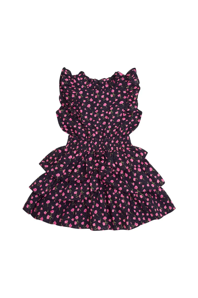 Our minis are sweet as can be in this darling Janelly Dress. With a high neck, this piece stuns with short flutter sleeves, an elasticated waistband and asymmetrical ruffle tiers. Embroidered lace adorns the neckline, sleeves, and the tiers on the skirt.