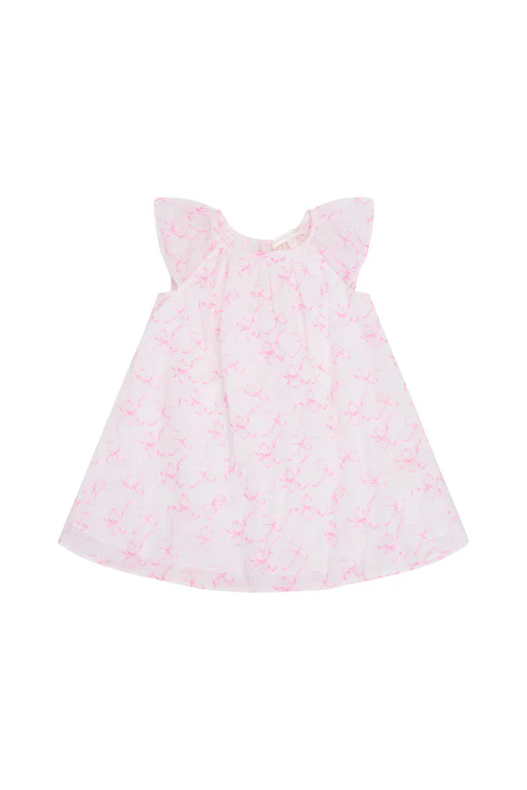 Skip along in our Lou Dress, easy in lightweight crinkle gauze. An incased ribbon ties in a bow at the circle neck, framed by flutter sleeves. The roomy bodice falls into a sheath silhouette, stopping above the knee.