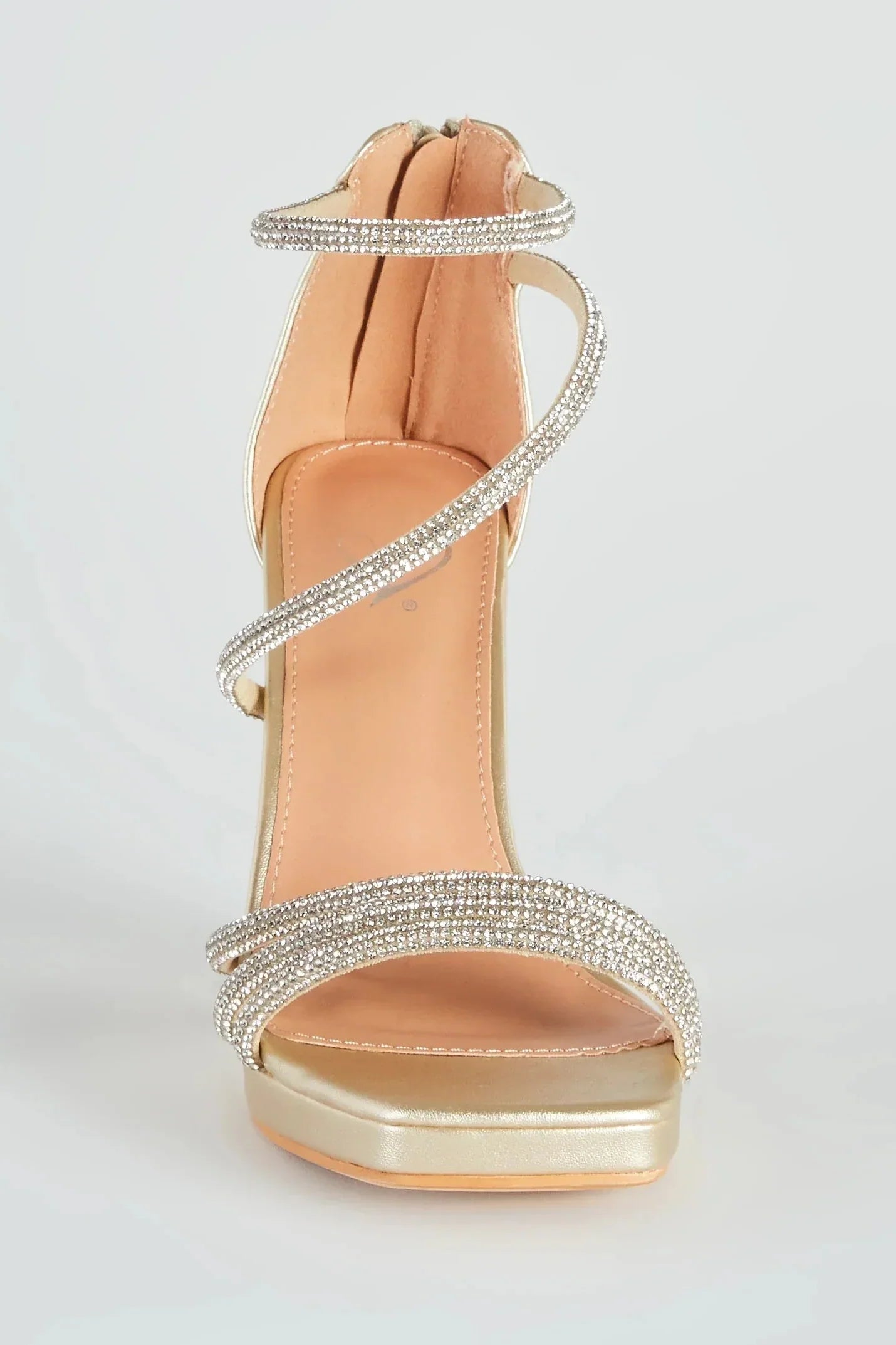 You'll be in glam mode with these gorg metallic platform heels that will level up your look! They feature an open square-shaped toe, an asymmetric strappy design with mini rhinestone embellishments, a closed back with a zipper, a platform sole, and a tall block heel. Style with a .