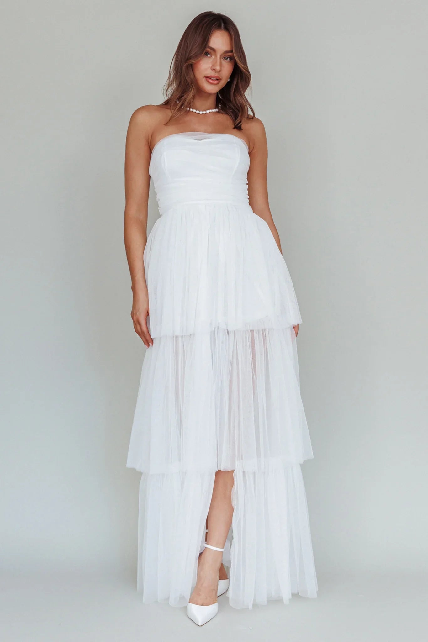 Make an entrance in our stunning Haeven maxi dress. We are in love with the romantic, cascading mesh tiers and classic strapless style. Perfect for a wedding or special occasion. Team it with white heels and a clutch for an unforgettable look.