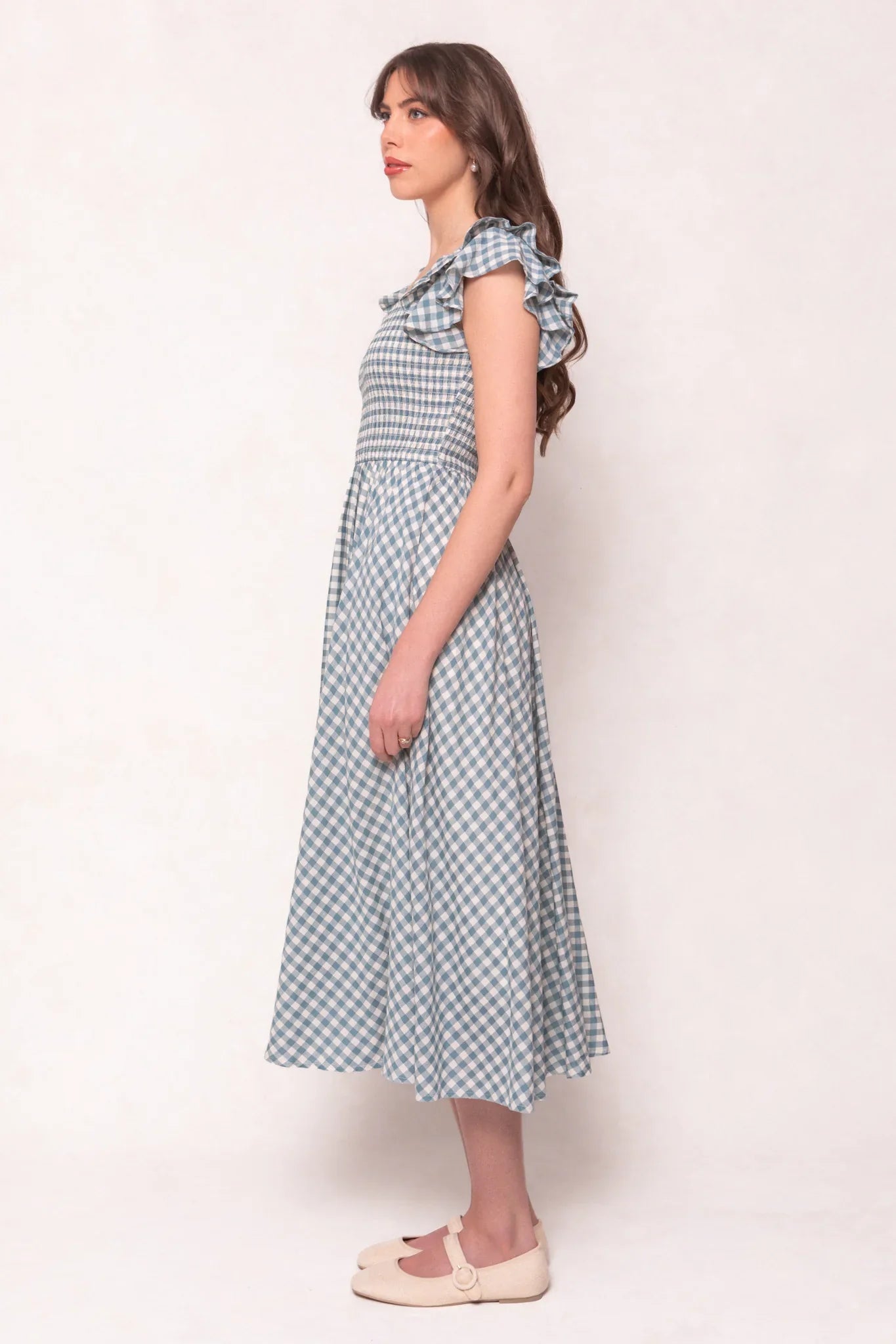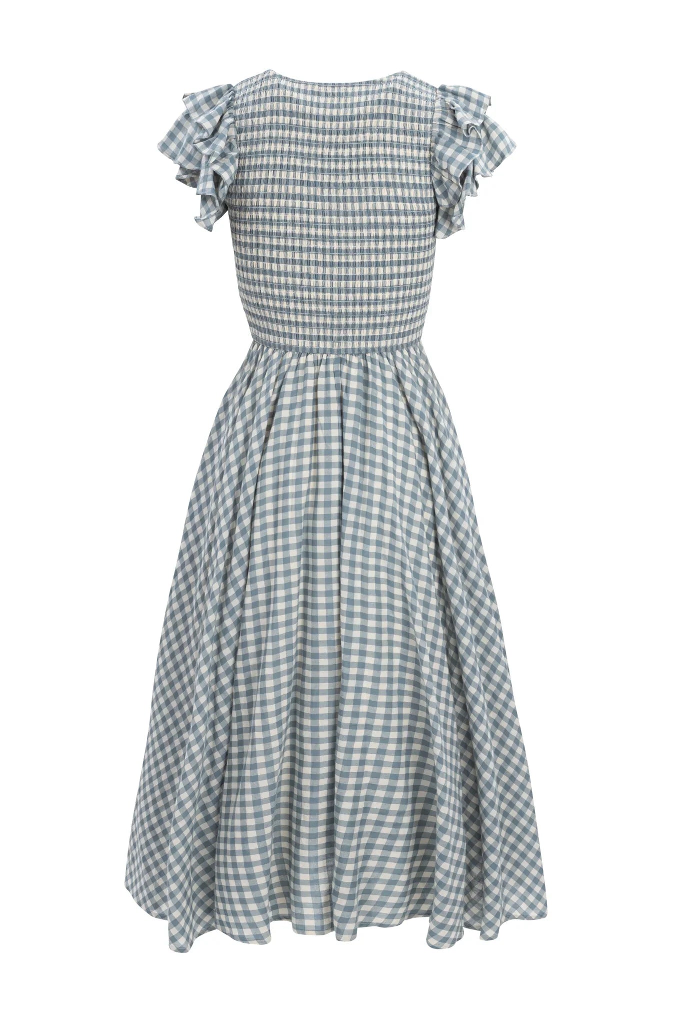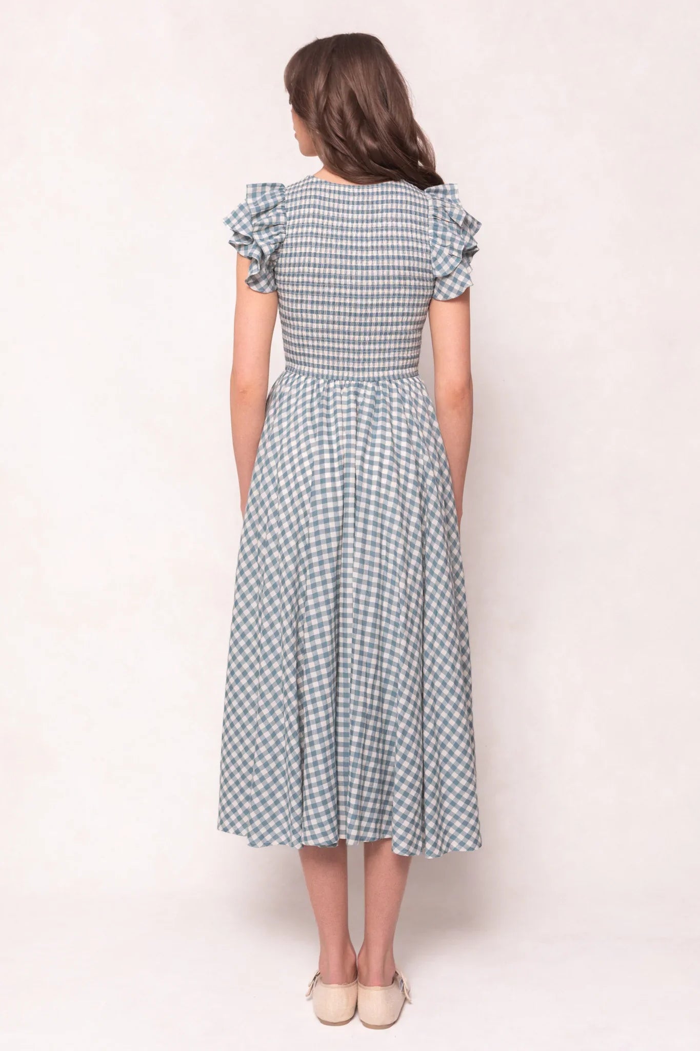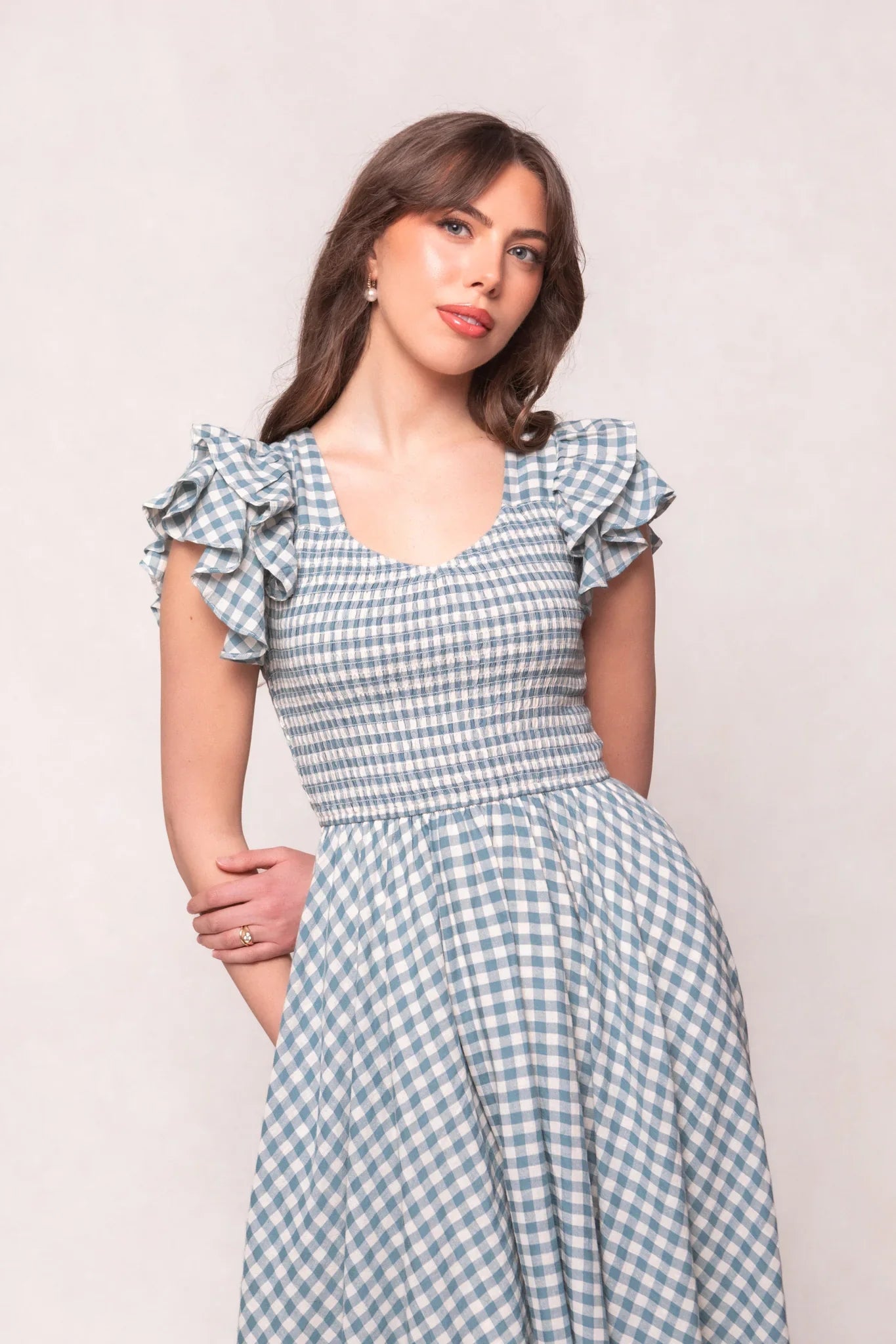 Introducing the Hattie Dress in Dusty Teal Gingham! Made of 100% cotton, this dress features a charming gingham print and a flattering sweetheart neckline. The tiered flutter sleeves add a touch of sweetness, while the midi-length skirt with pockets makes it practical as well. Perfect for any occasion, this dress is a must-have for your wardrobe!