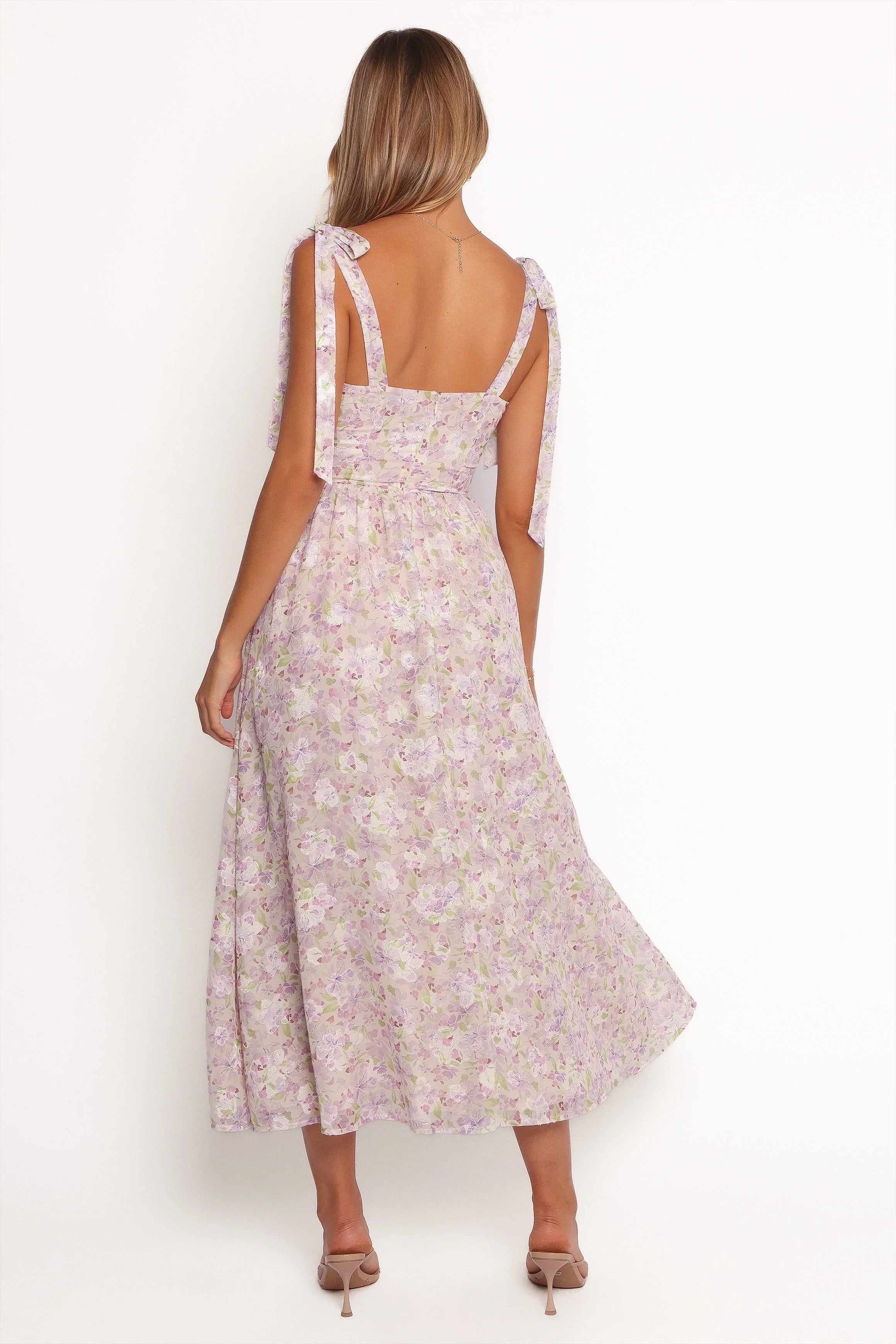 DETAILS Make an entrance in the Hayden Maxi Dress in Purple Floral. With its flowing A-line silhouette, straight neckline, and pleated bust detail, this stunner brings effortless elegance to any occasion. Adjustable tie straps and an invisible zip with a hook-and-eye closure ensure a perfect fit every time.