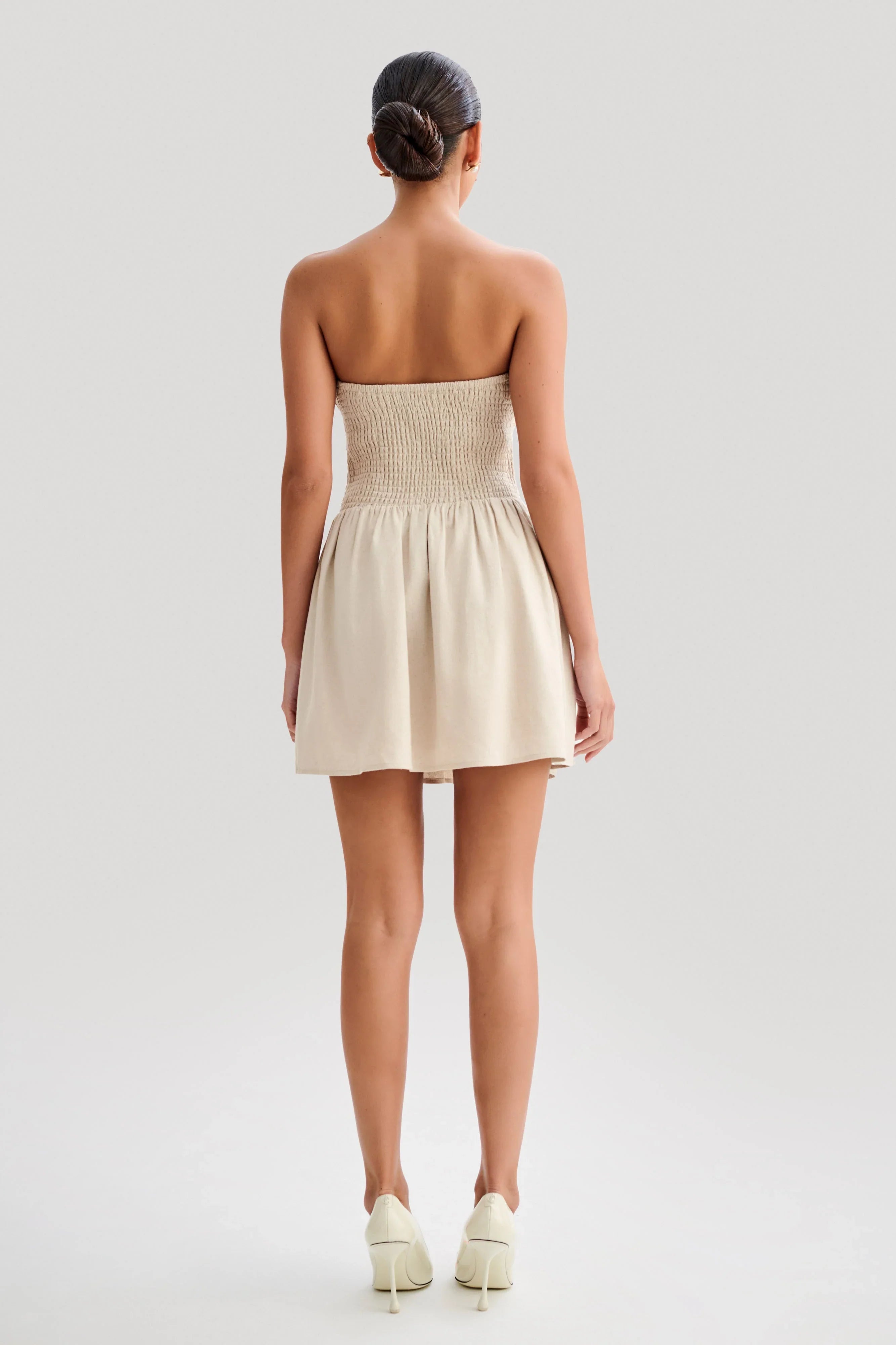 The HOLLAND is a linen mini dress designed with a shirred bodice that meets a gathered skirt, creating a playful silhouette.